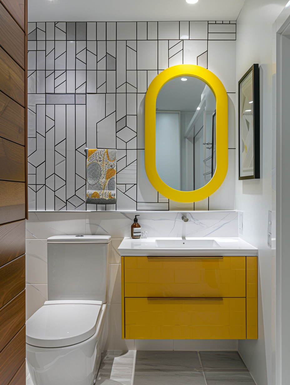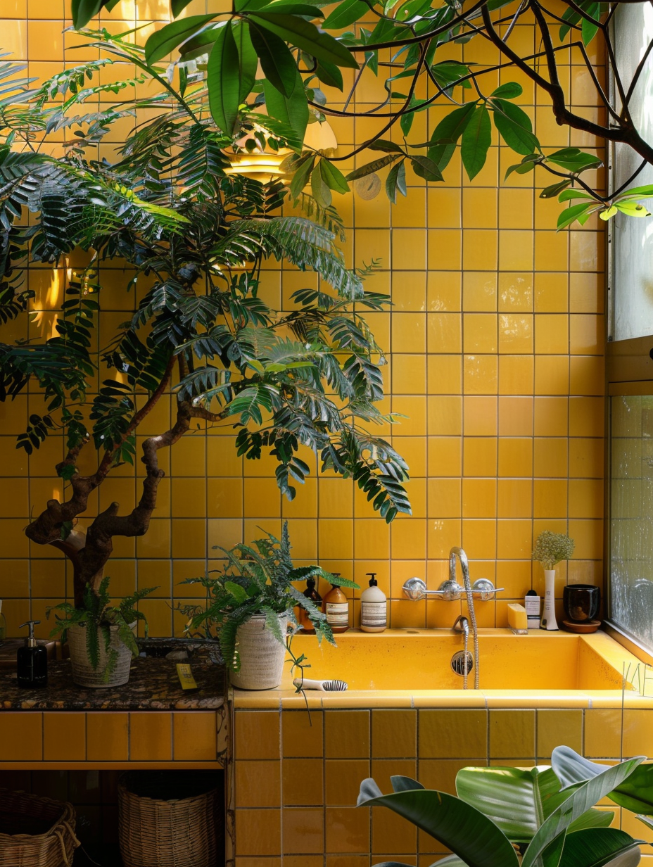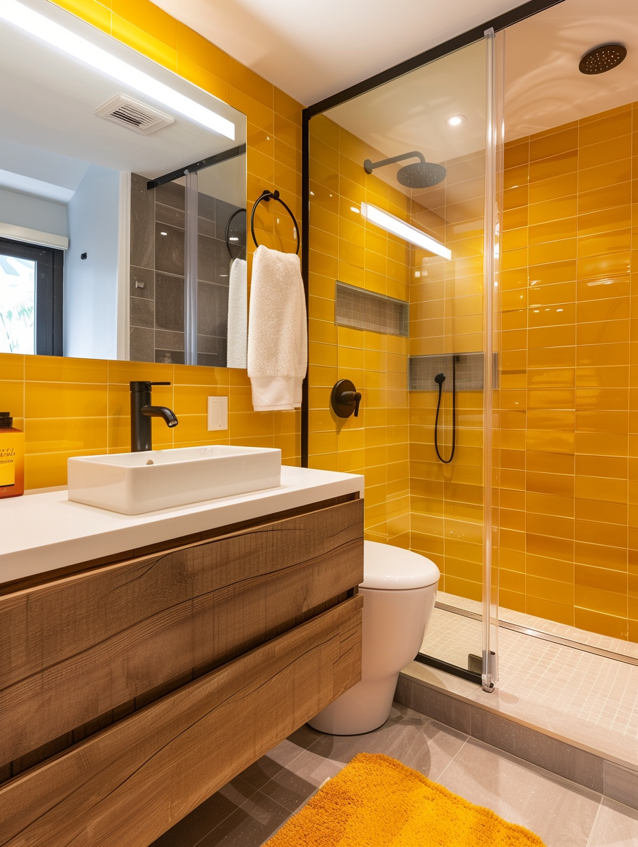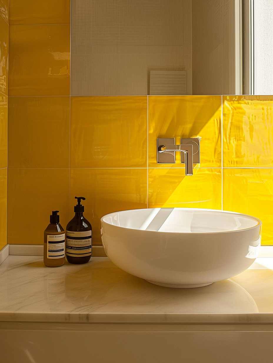 Your bathroom can brag about a yellow tiled backsplash making it look stylish and unique. Choose a design that complements your overall aesthetic and pair it with neutral walls and fixtures for a balanced look. This can be an excellent project for those looking to update their bathroom with a fresh, modern feel.