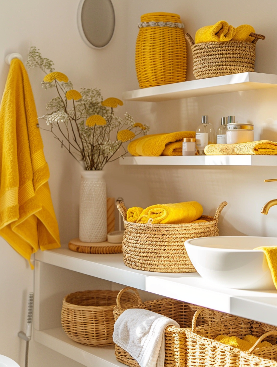 Idyllic lemony storage solutions will be bringing sunshine and beauty to your bathroom at the same time keeping it neat and organized too. Opt for yellow baskets, shelves, or cabinets to line the space and inject a burst of color. This is a pragmatic and well-liked method to upgrade the usefulness of the bathroom.