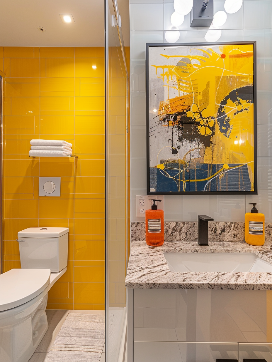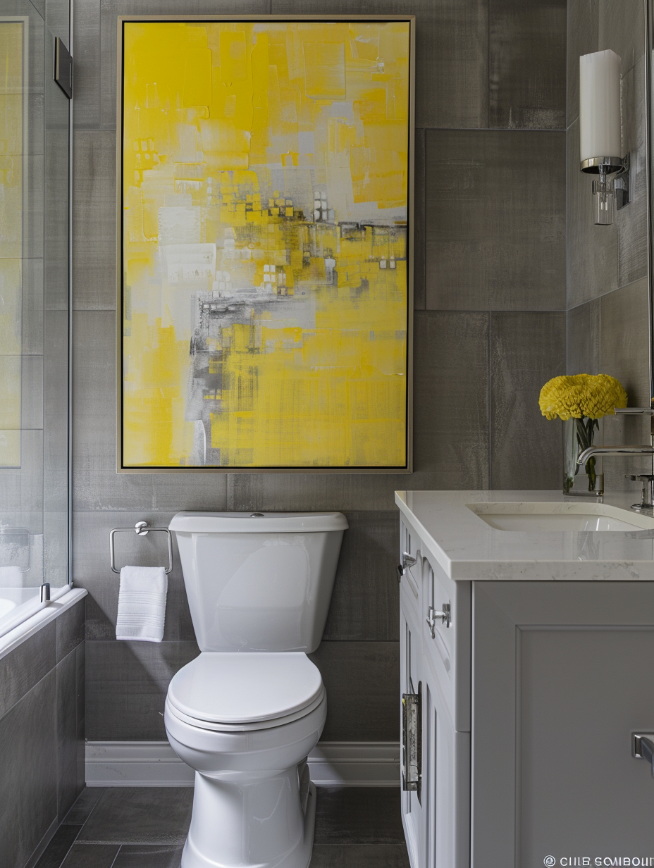 If we add the yellow artwork to our bathroom, we can create a creative and personalized space. Select items that reflect yourself and match them with accessories of the same color for a complete look. You could start us this way without making a large-scale commitment, at first. Art objects are easy to alter or just introducing something different will keep the environment stimulating.
