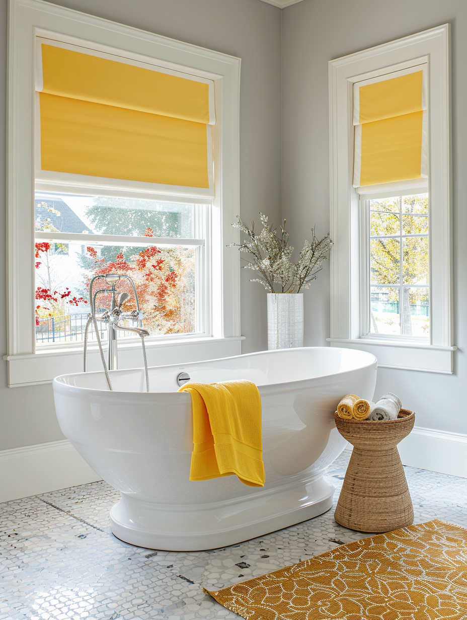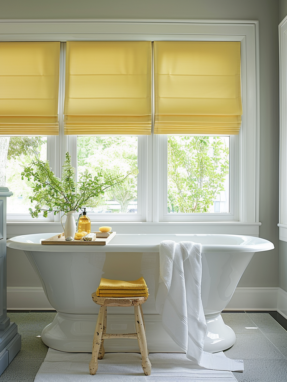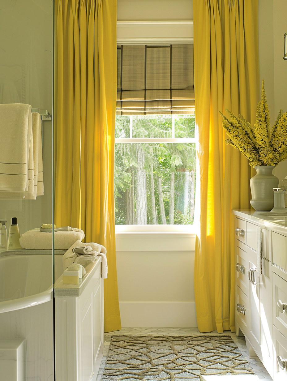 Bright yellow window treatments can create a sunny and cozy feeling in your bathroom. Seek out curtains or shades that work well with your whole setup and complement them with other accessories of the same color to bring the decor together. This will flood your room with natural light and a gleefully positive mood.