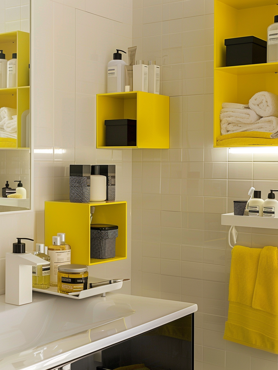 Bright yellow shelves may also serve as a storage and a decor element to your bathroom. Let them arrange your room and make them a decorative part of the matching overall decor. Yellow shelves can be a good way to attract light into your bathroom and also be a storage solution that is both practical and style.