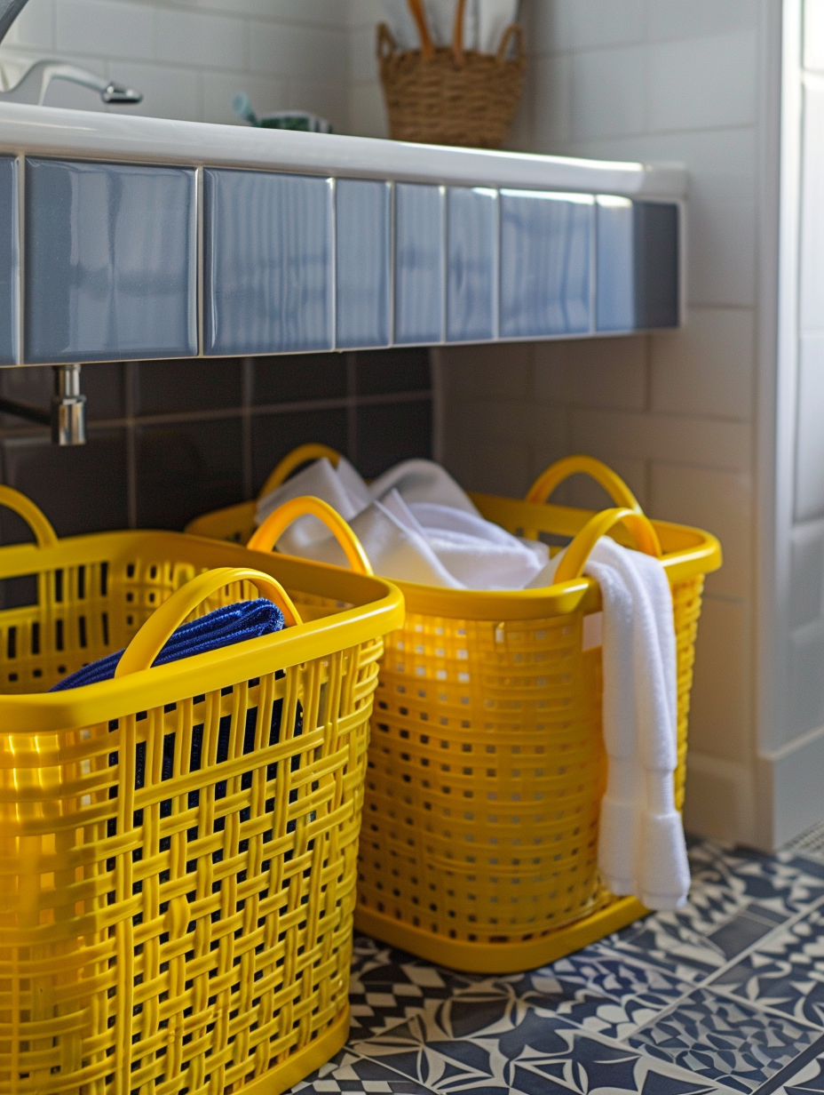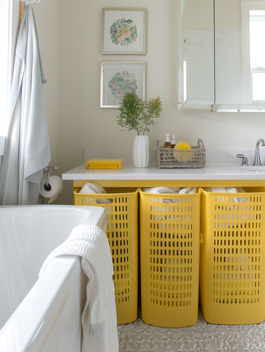 Laundry baskets can be a lot of yellow. The bathroom organizing will be so cheerful with yellow laundry baskets. Select some which are compatible with your decoration and pick some yellow objects to be your decorations with. The chances for a monochromatic yellow decoration will be increased by the proper choice of the baskets and other yellow accessories.