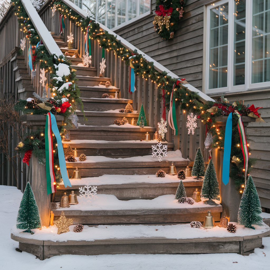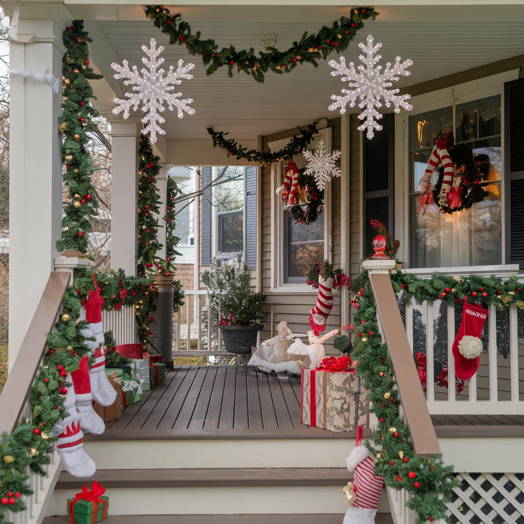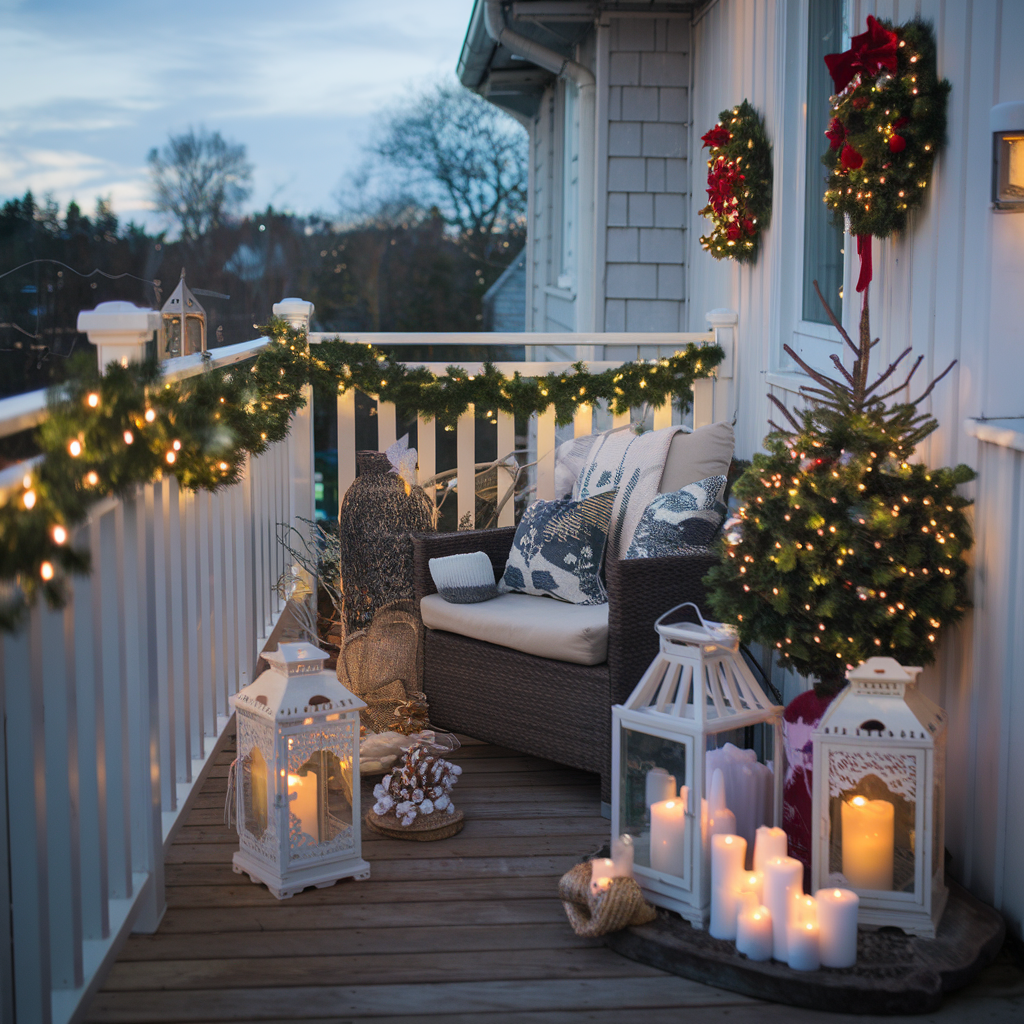 Make your balcony or patio a festive spot with outdoor Christmas decor. Hanging garlands and wreaths on railings and walls is the first step. Add Christmas lights to create a warm glow, and place lanterns or LED candles on tables and steps. A great idea is to integrate snowflakes, stockings, or even a small Christmas tree for a unique style. This simple and fun decoration idea will make your outdoor space cozy and inviting, perfect for enjoying the holiday season outdoors.