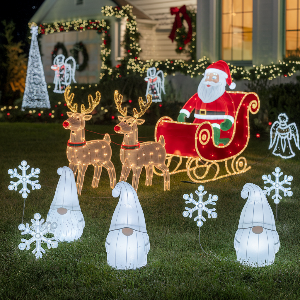 Let your lawn be a little wacky and different with illuminated Christmas figures like Santa Claus on a sleigh with LED reindeer or glowing faceless gnomes. These figures are a way to bring joy and merriment to the yard when they are done together with LED snowflakes and angels. A quick and unique decoration idea with which you can turn your yard into a real-life Christmas spectacle is what we will be looking for.