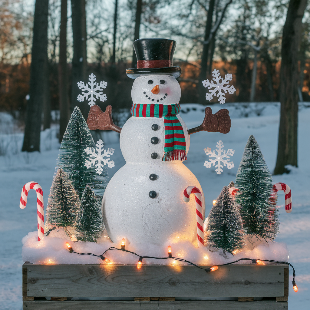 A snowman-themed display is a fun and classic way to add a whimsical touch to your outdoor Christmas decorations. You can choose the typical snowman statue, which is built of robust materials and built to resist the harsh winter, or you can make a snowman from scratch stacking planters and decorating them with green plants. On the other hand, you may surround your snowman with LED snowflakes, miniature Christmas trees, and candy cane lights to complete the picture.