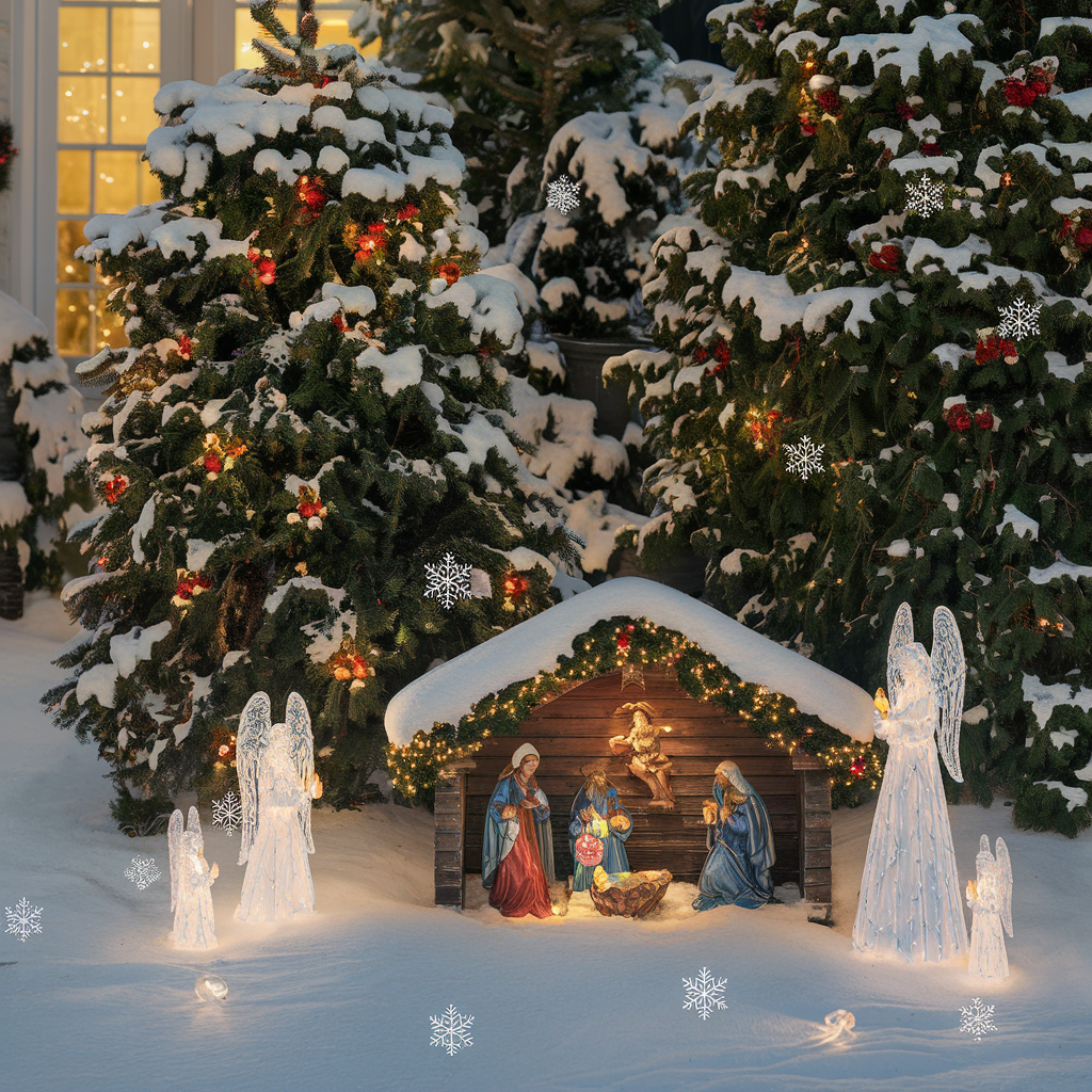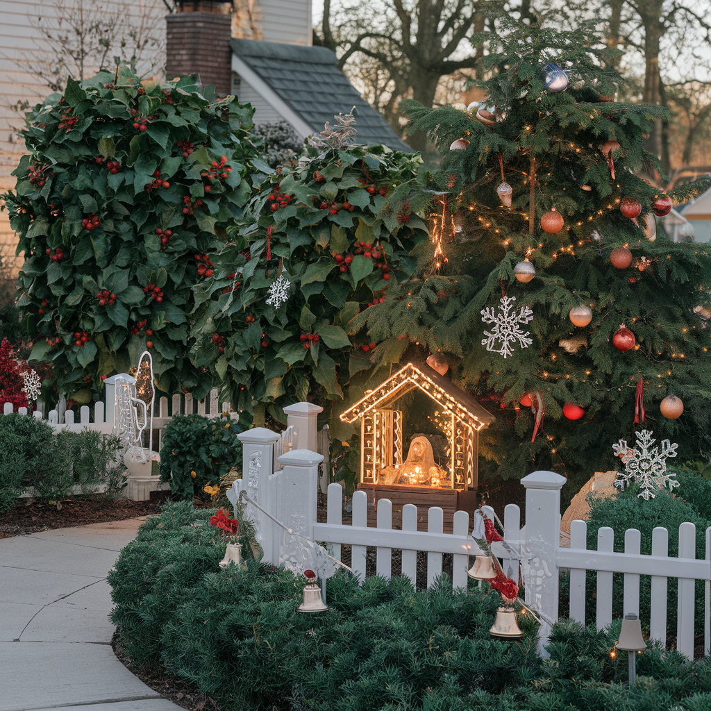 The addition of traditional Christmas decorations to your garden is a great way to create a festive atmosphere in the classic style. Holiday decor such as holly bushes, decorated with ornaments and lights, LED angels, and pine trees with twinkling lights can be placed around the garden. Add an LED nativity scene, as a spiritual focal point, and hang snowflakes and bells all over the garden for decoration. The use of natural materials in a timeless way will not only give the garden a festive feel but also make it look serene and peaceful, the most appropriate for the Christmas season.