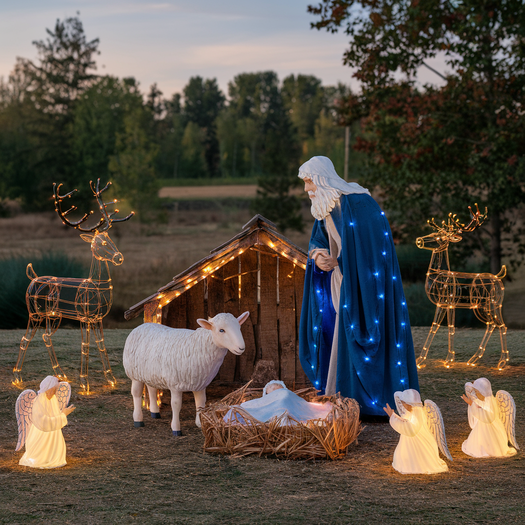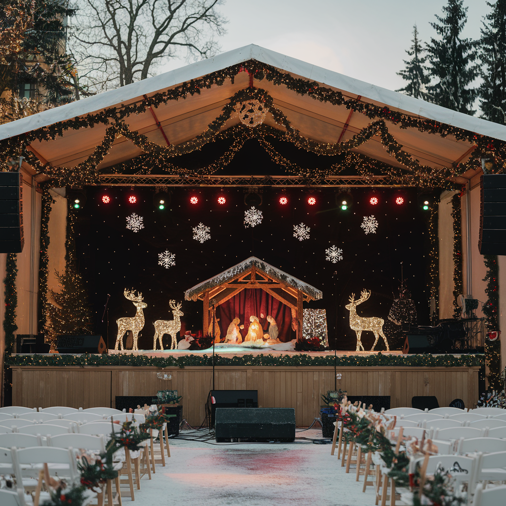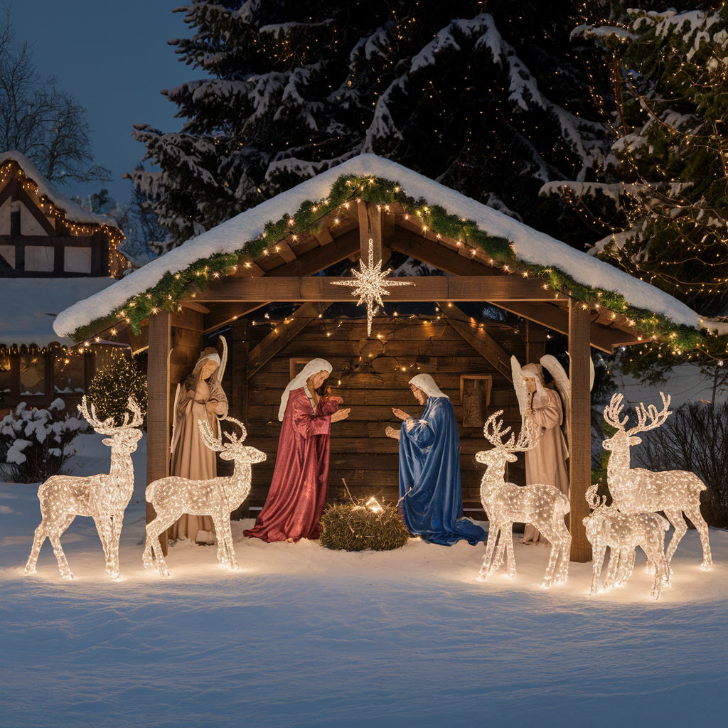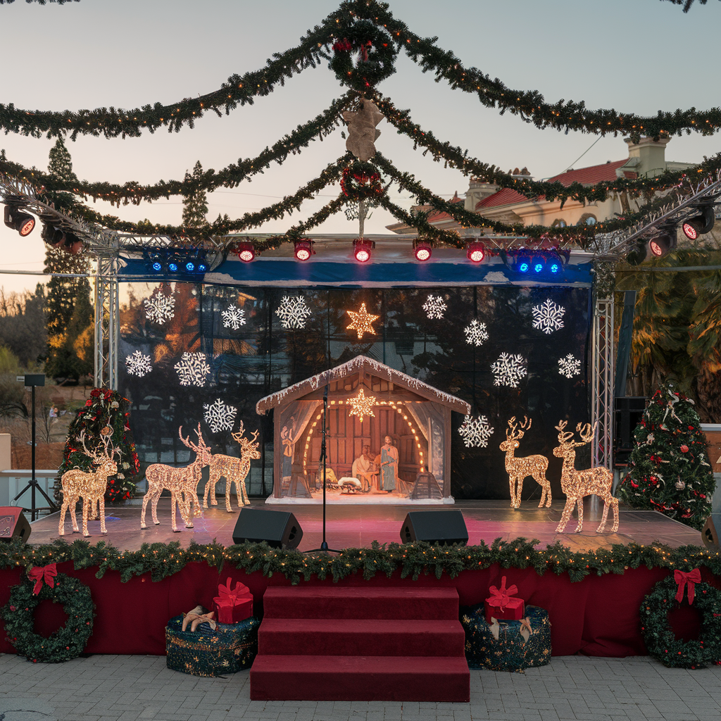 Assembling Christmas stage in your garden for caroling or concerts brings life and fun to your holiday decorating plan. To start, assemble a simple wooden platform and decorate it with garlands, wreaths, and Christmas lights. LED reindeer and snowflakes on the stage will make the visual effect even more interesting. Then, finish the installation by adding a nativity scene with LED lighting as a background, which will add a spiritual aspect to the Christmas concerts.