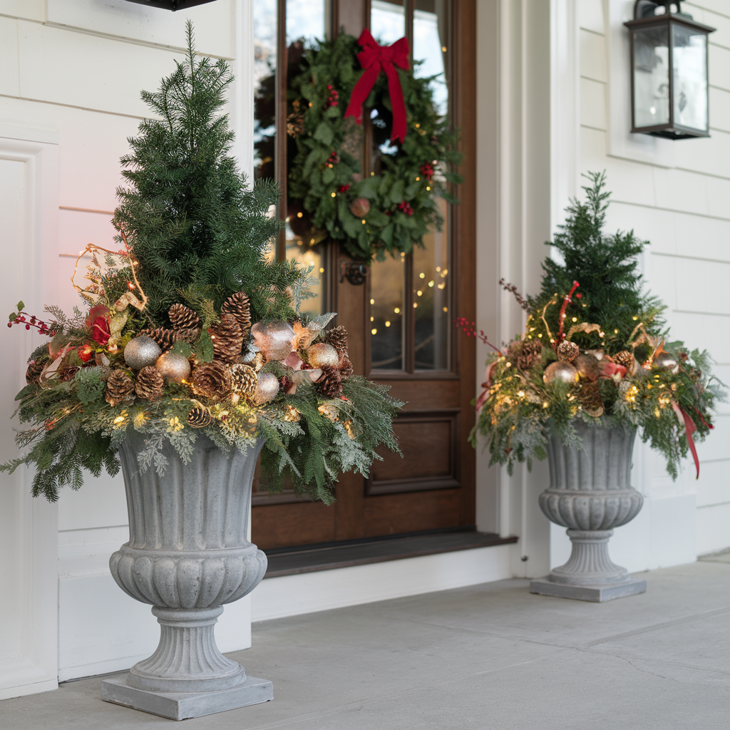 Christmas planters and urns are beautiful design accents that will definitely add a Christmas spirit to your front porch or driveway. These modern vessels can be filled with lovely seasonal modulations such as greenery, ornaments, pine cones, and ribbons. Apart from that, you can also add LED lights or stars that glow to make it more engaging. You can position the plant pots on both sides of your house entrance and make your entryway look sophisticated and friendly. This irresistible and authentic idea is a great way to bring a touch of nature and elegance to your doorsteps and your whole neighbourhood.