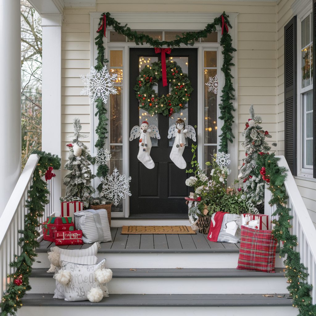 Using your porch as a part of holiday decor is such a great way to create text twist the whole neighborhood into a welcoming place. Hang some garlands on the door, tape large snowflakes on the walls, and include LED angels with their guarding hands. Makeup the look with several Christmas stockings lying around the railings and a wall’s bow with pom-pom wreaths. The hand-made effect is clear and it is simple and may evoke feelings of returning home holidays in guests.