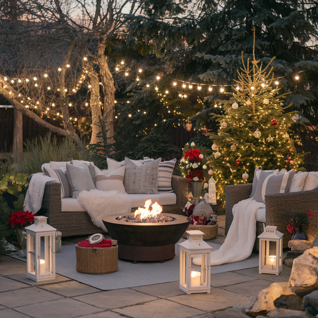 Conceptually, create an outdoor Christmas lounge area where you can relax and party with your friends and family. Begin with the comfortable seating like outdoor sofas or chairs, and then add the plush blankets and pillows in festive colors. Adorn the area with Christmas lights, lanterns, and a small Christmas tree. Position a fire pit or heater nearby to stay warm on cold evenings. This joyful and warm setup will make the perfect spot for enjoying the holiday spirit outside the home under the company of family and friends.