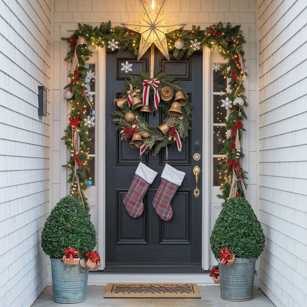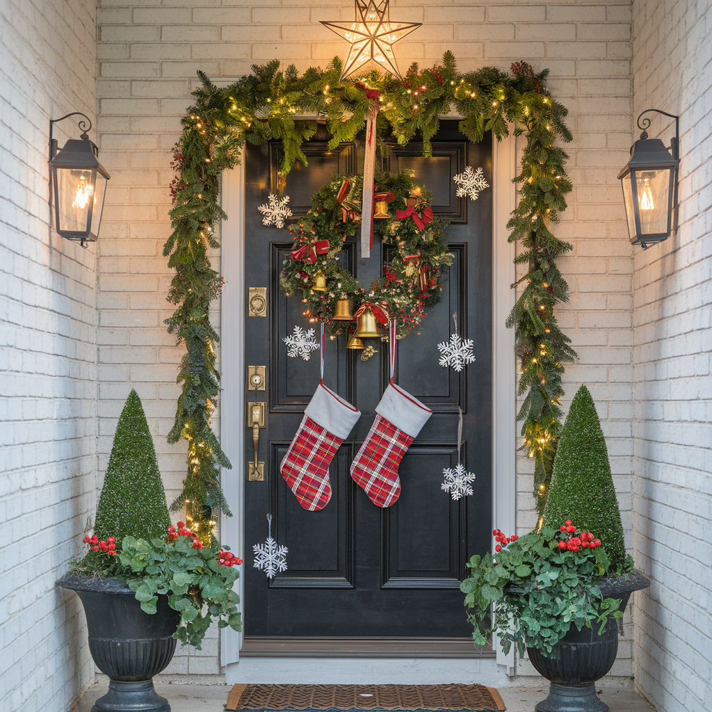Your front door, the center of the outside part of your house, is the best spot to exhibit your Christmas decorations that you thought up. Go with a classic wreath that is trimmed with bells, existing ribbons, and led lights. Add the stockings that are hung on the handle of the door and the garlands and the snowflakes that are spread around the door on both sides and in front of it. The illuminating star is hung above the door or the LED gnome is faceless which is positioned at the door.