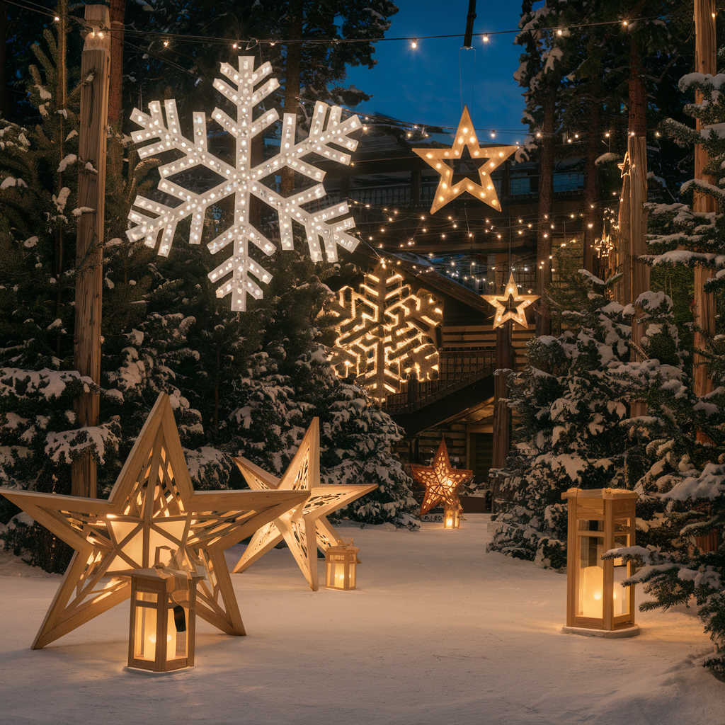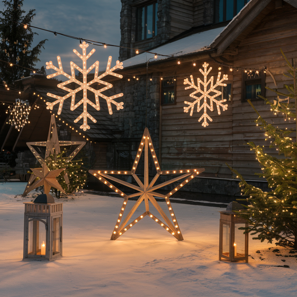 Sprout out the giant white snowflakes in your garden to change it into a winter wonderland. These way big snowflakes can be placed in your lawn, hung up trees, and even attached to the wall surface of your house. Pick LED snowflakes for your display so your pieces will make a nice glow that will light up the night. You can also add more wooden stars or lanterns for a special look and timeless atmosphere. This simple and hand-made decoration will make your yard look natural and lovely, which is why it is very good for having a nice winter holiday.