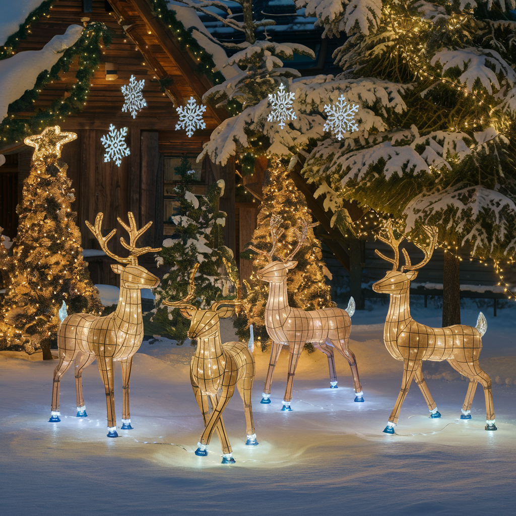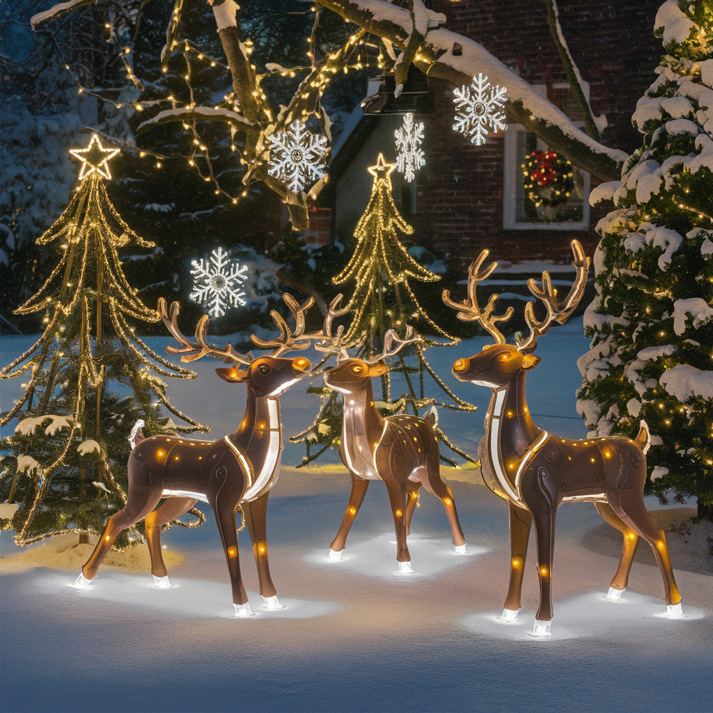 LED reindeer are one of the key elements of the outdoor Christmas decorations, adding a bit of magic to your yard. Set these luminous animals in different stances on the grass, for example, pulling a sleigh or walking around a tree. Join them with LED snowflakes and lit Christmas trees to get a harmonious style. The merry and beautiful decoration is a quick-to-install and traditional element for your outdoor holiday decor that will make your front yard look brightest during the festive winter days.