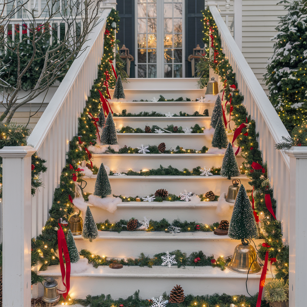 Outdoor staircases are ideal for adding some holiday cheer to your home’s exterior. Wrap the railings with garlands and ribbons, and add LED lights for a glowing effect. On the steps, place wreaths with hanging snowflakes and bells on a small Christmas tree. Aim for a very natural look by choosing the main colors: brown and greens, with pine cones attached. This simple and unusual solution for the staircase is going to be the element in the overall decoration that grab everyone’s attention during the Christmas.
