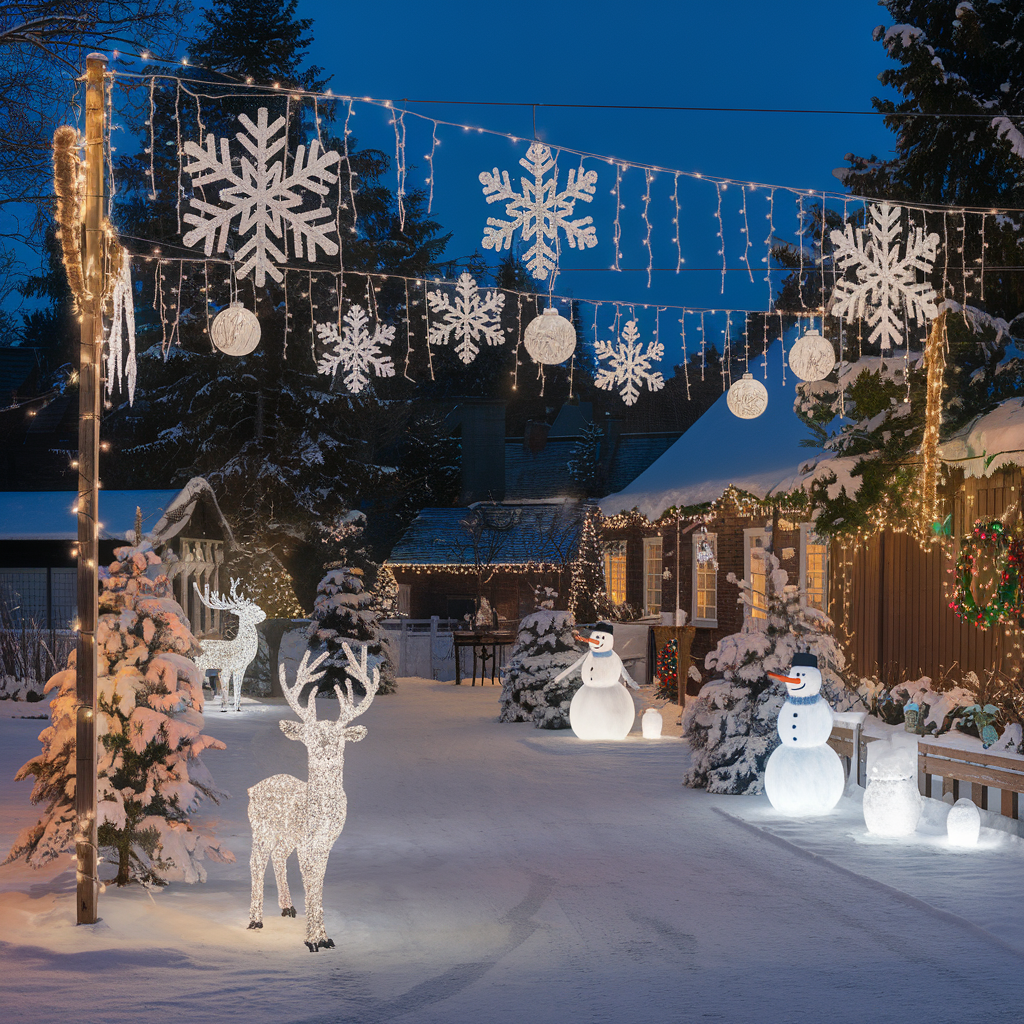 Winter-themed Christmas decorations are a great way of making your yard a winter fairy tale. White LED lights draw attention to trees, shrubs, and the house and the effect is similar to fallen snow. Add mild snowflakes, icicle lights, and a touch of frost to the ornaments for this approach. Use LED reindeer and snowmen to animate it. If you want to emphasize the beauty of nature in your holiday display you can do it by adding pine cones and holly. This classic style will take your yard to a magical winter setting.