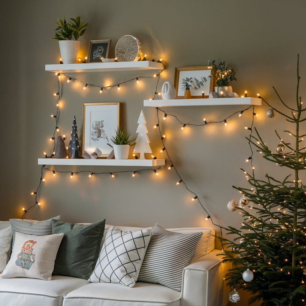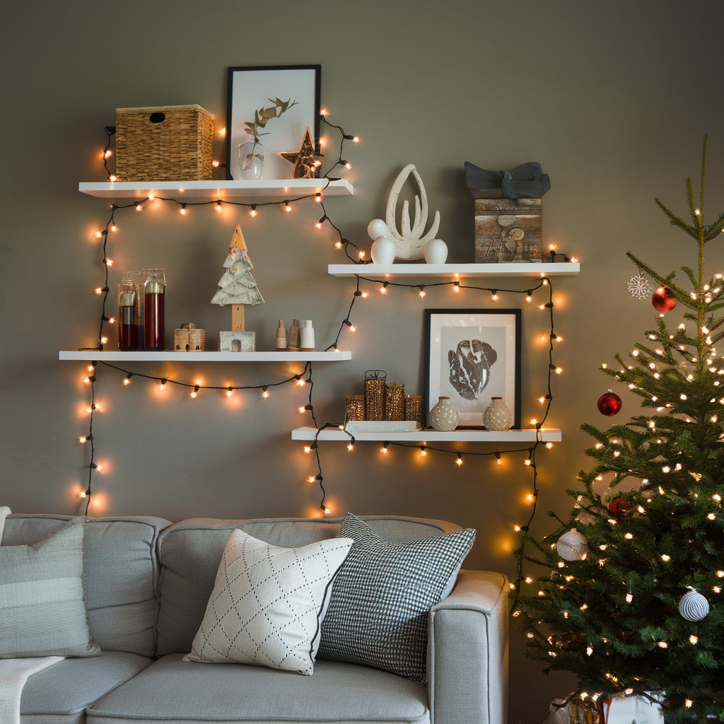 Christmas Lights Wrapped Around Wall Shelves