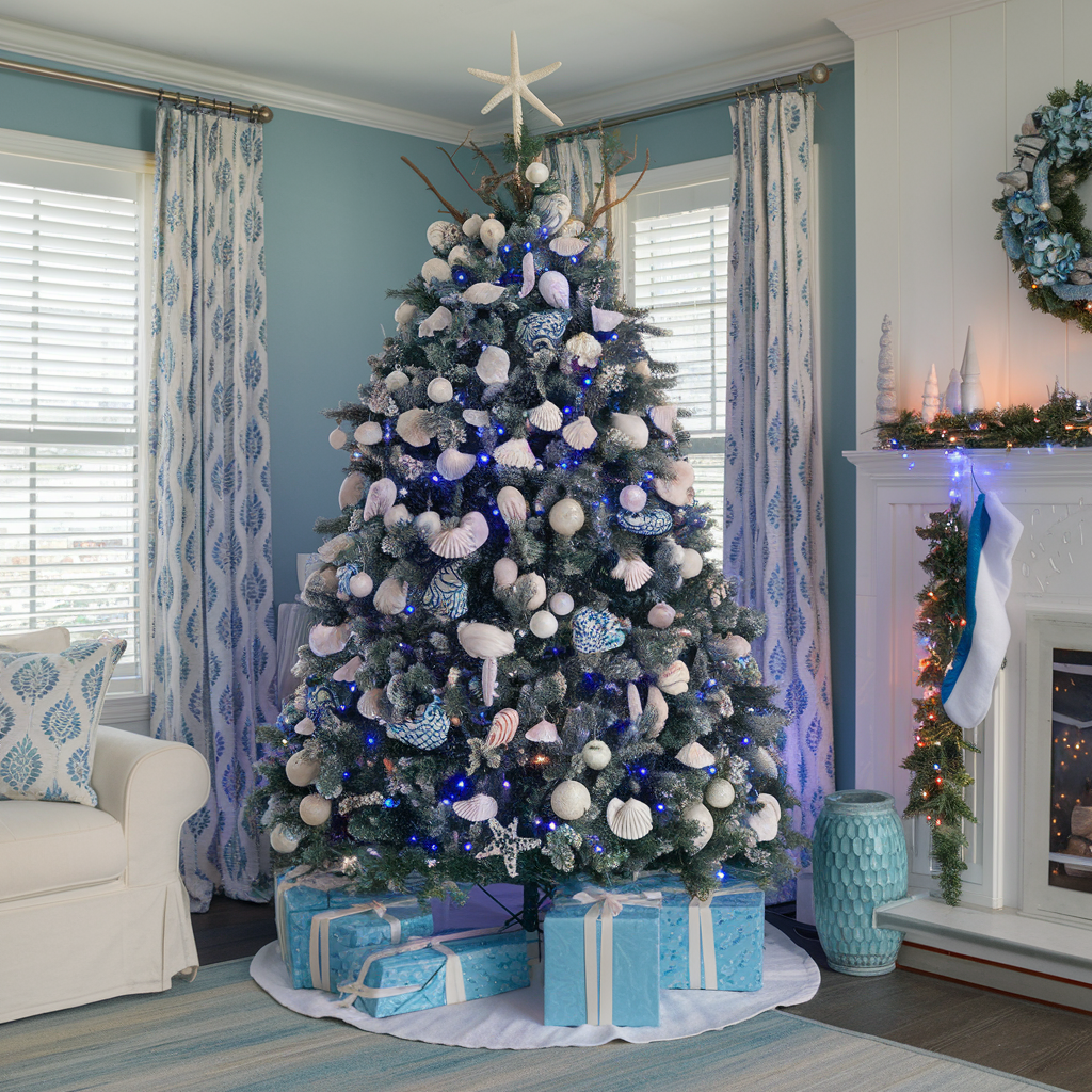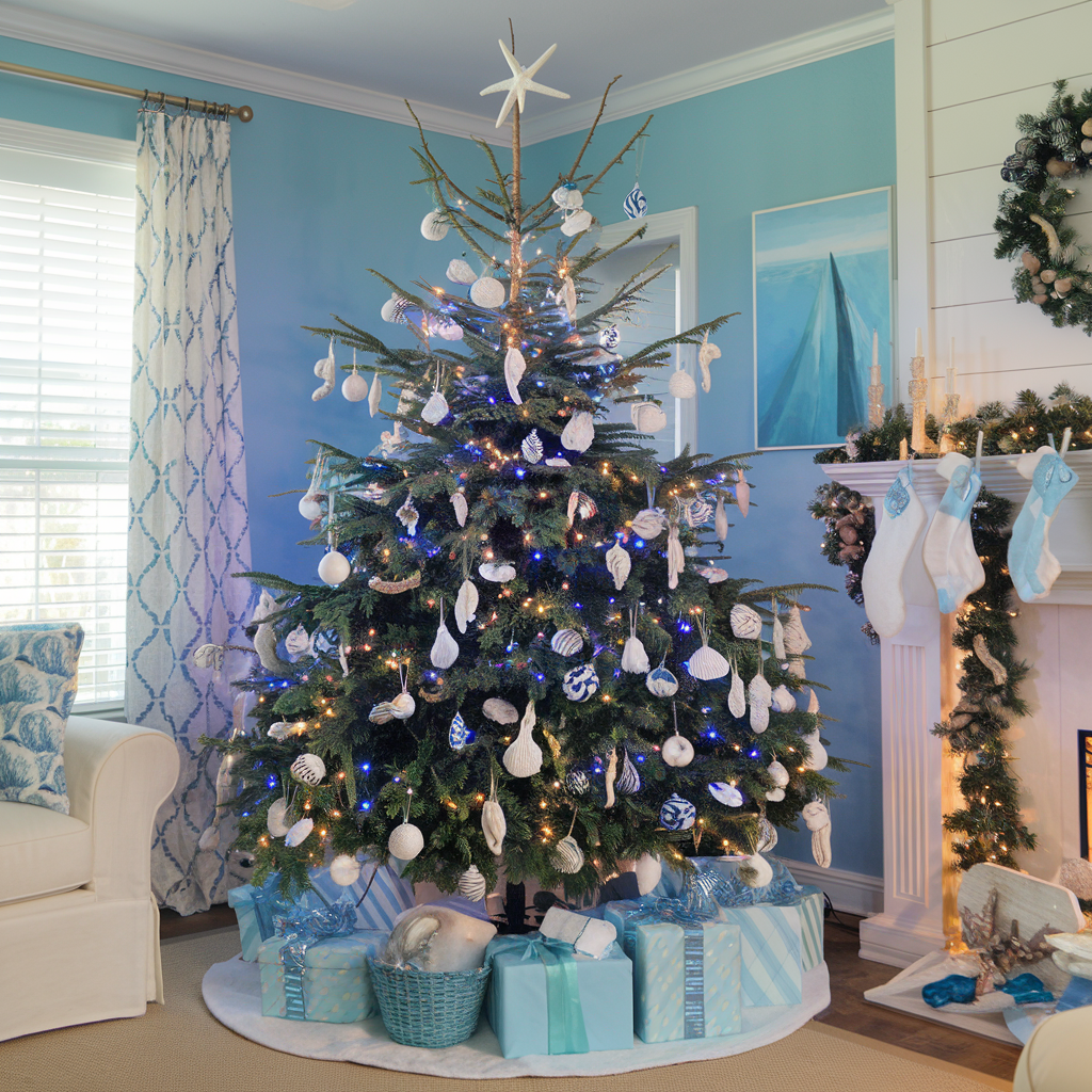 Coastal Christmas Tree Ideas with Blue and White Lights