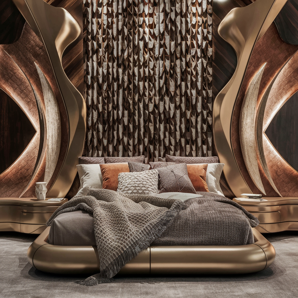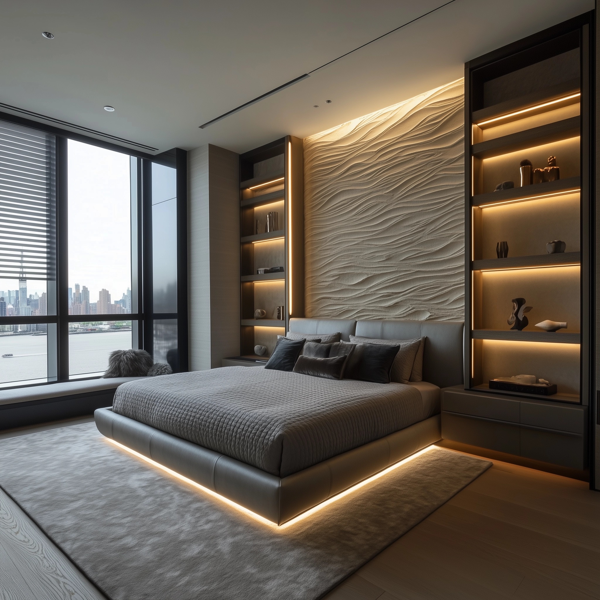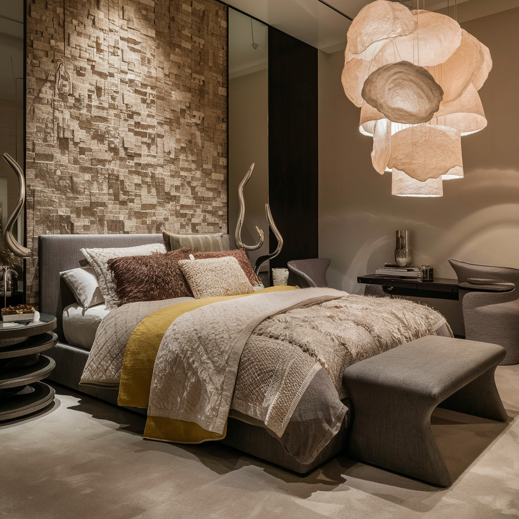 Creating an impressive 3D volume in a chic bedroom means using layers, textures, and architectural elements to make the space more fascinating and deep. Setting the scene with a textured accent wall such as 3D panels or a fancy wallpaper with a raised pattern already. Create the multi-layered bedding by using the variety of textures such as cotton, velvet, and faux fur. Tapered, rounded furniture can also make the room look larger.