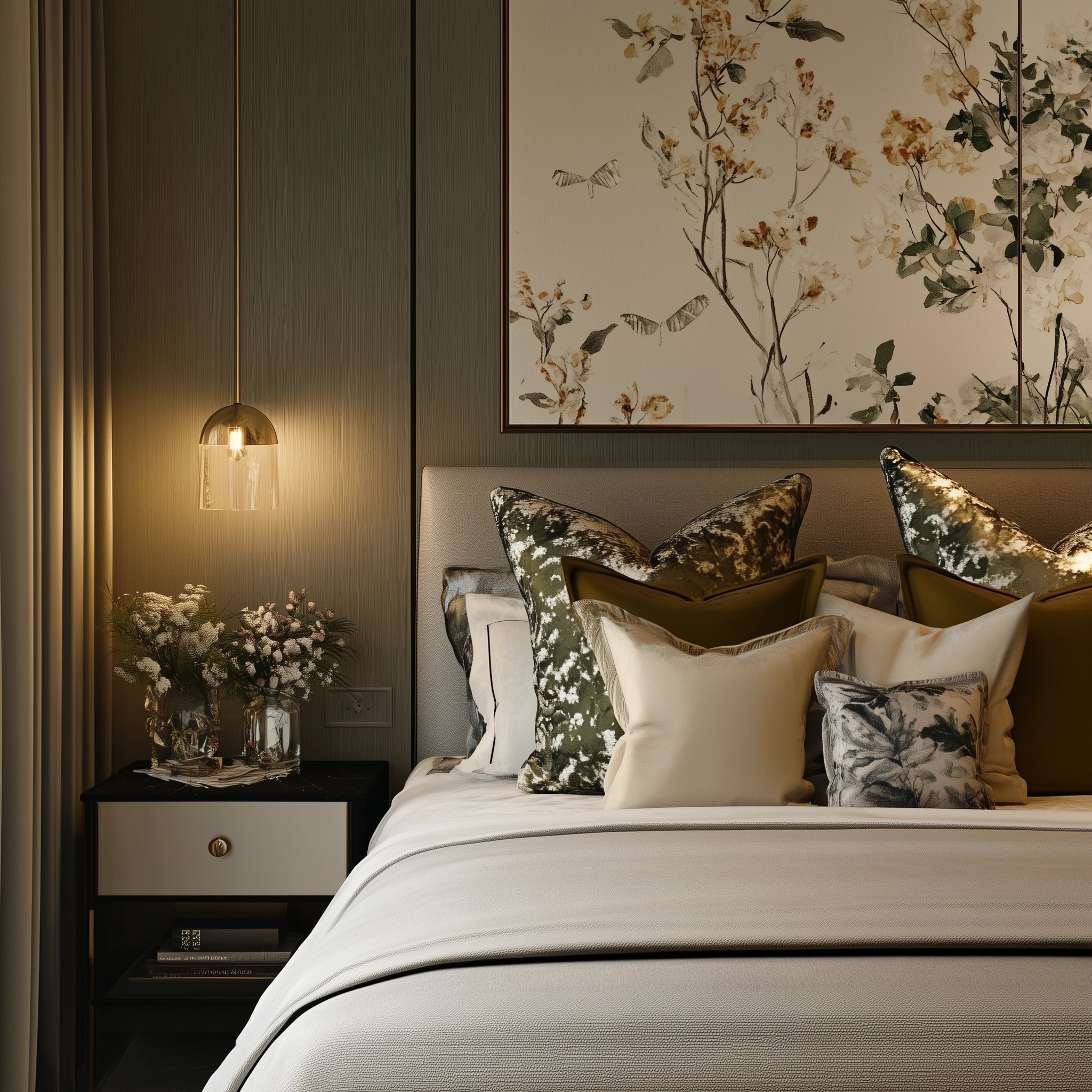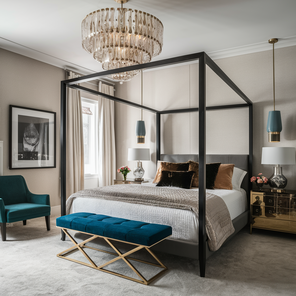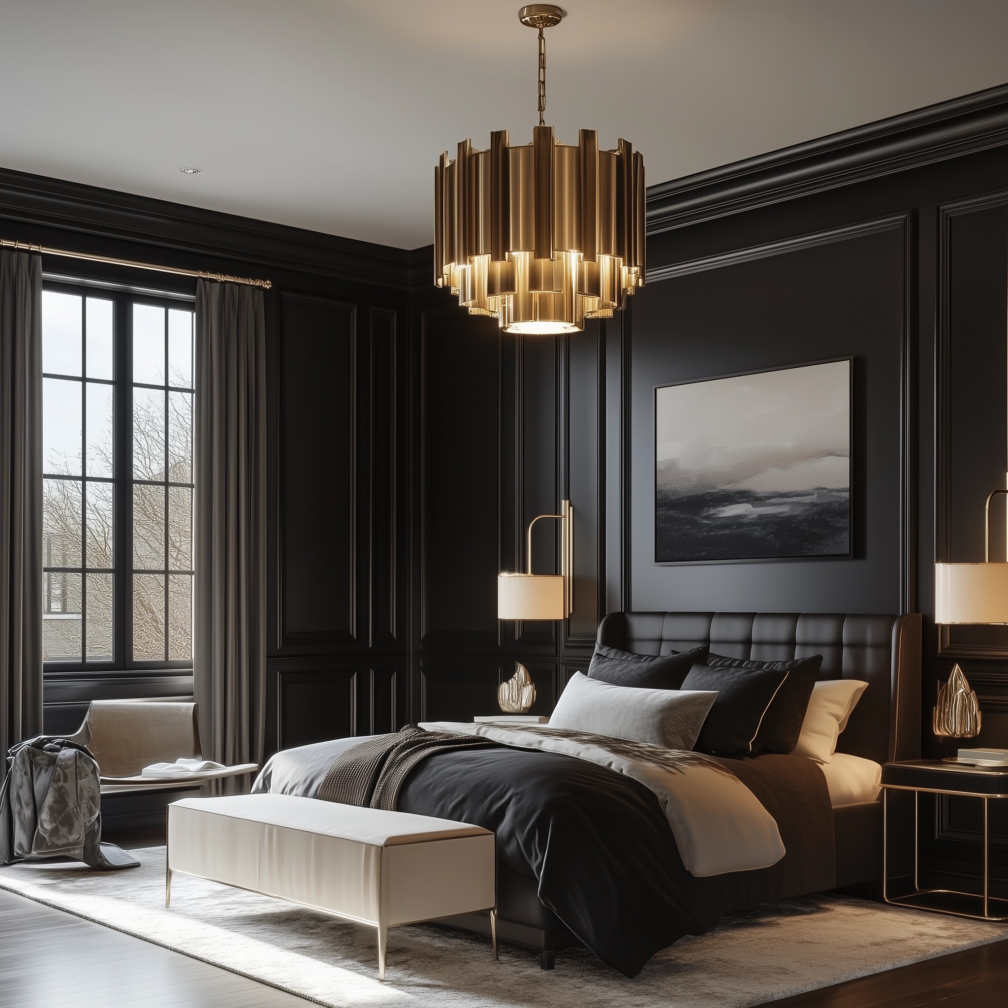 Specifically, the use of high-quality design elements is an art that combines the attractiveness of the space with the utility of its features. Begin with a vibrant color palette and perhaps think of including a deep, luscious shade like emerald green or midnight blue. Bring in luxury artistries, for example, a velvet adorned bed, brass or chrome trimmings, and glossy wooden furniture. Let’s try to think in terms of statement like a designer chandelier or a pair of modern pendant lights for the lightings.