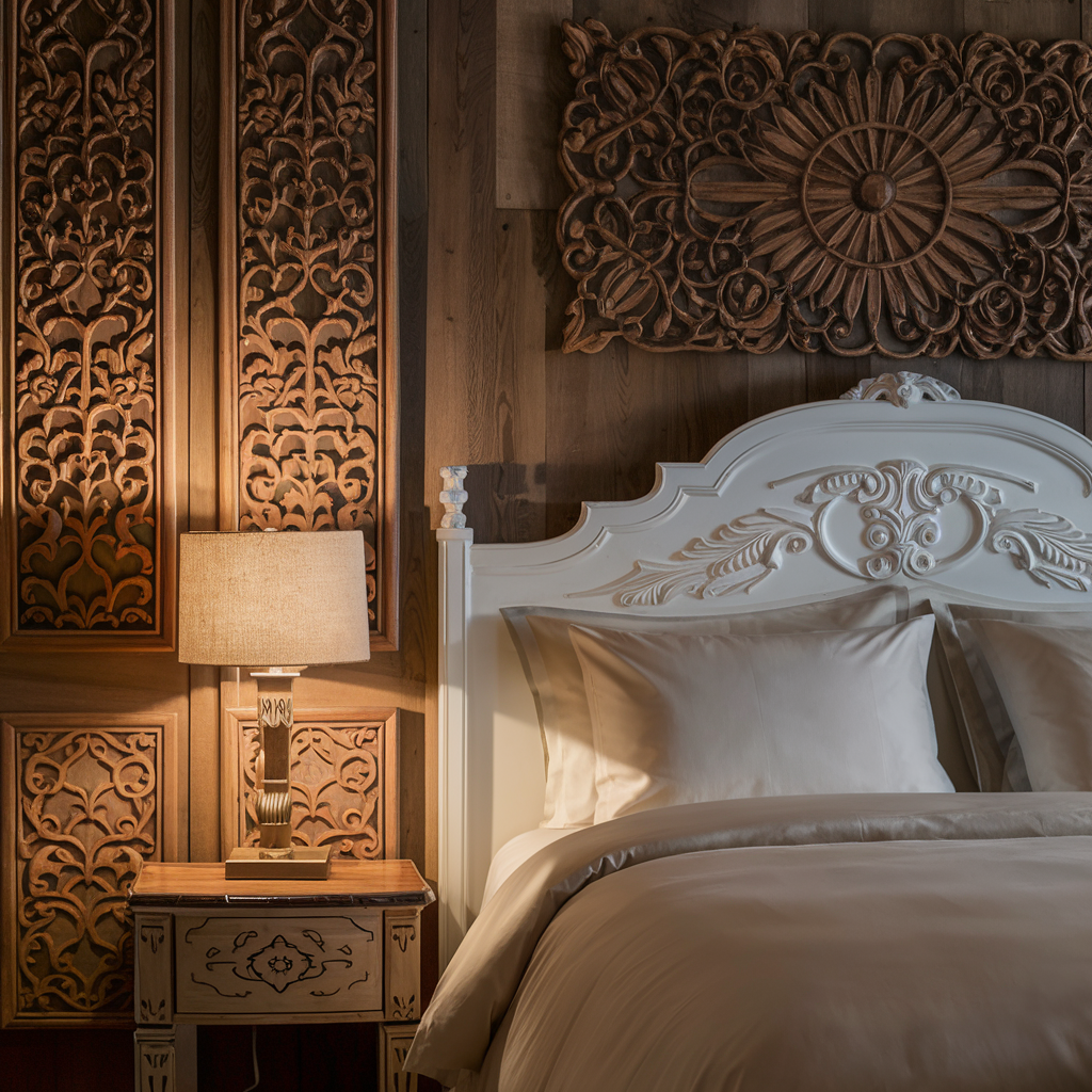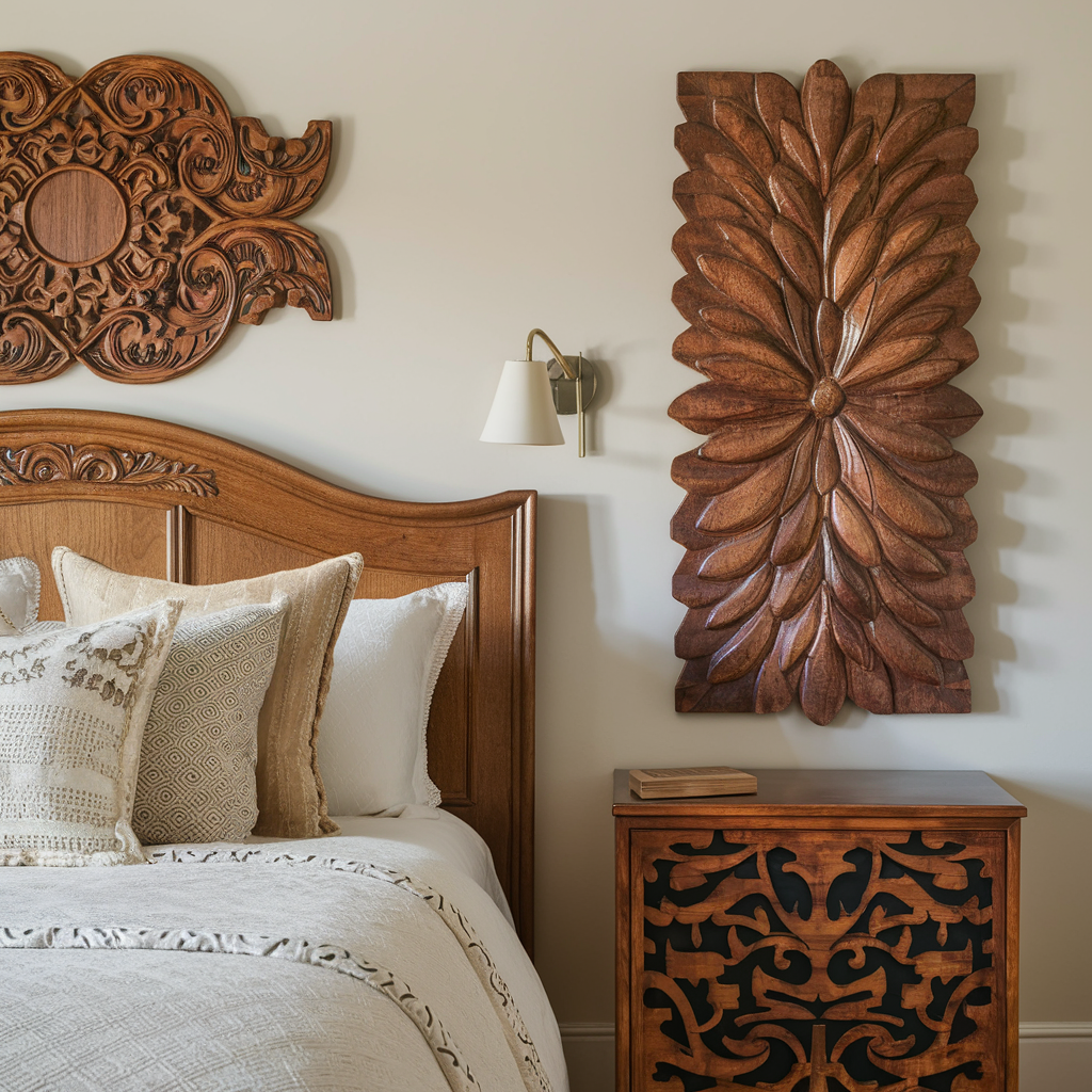 Carved wood can be an indication of uniquity in a chic bedroom design, which, in addition, gives a sense of comfort and welcoming. As an option, you can use a carved wooden headboard as the centerpiece, injecting a bit of authenticity and detail in the room. Wooden wall art like a carved panel or sculpture could provide that extra touch of interest and texture. Set a side table with a touch of elaborate wood to make the geaesthetic of the entire area more complete.