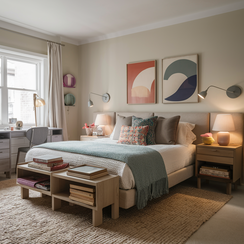 Creating a pleasant bedroom layout that caters to different homely preferences with a view to making a peaceful environment for both. One way to make your room look great is the use of a color palette that is appealing to both of you, for example, warm gray, soft white, or cool blue. The bed must be in the focus position, flirting with a couple of lush, elegant tufted or upholstery. Symmetrical nightstands and stylish lamps, on the other hand, promote visual weight with the addition of a comfortable zone in the midst. Spices can be thrown in with a shared artwork or little treasures purchased earlier on.