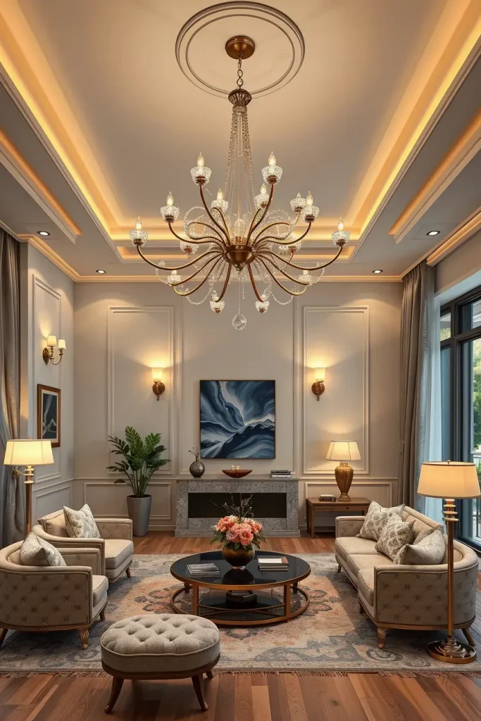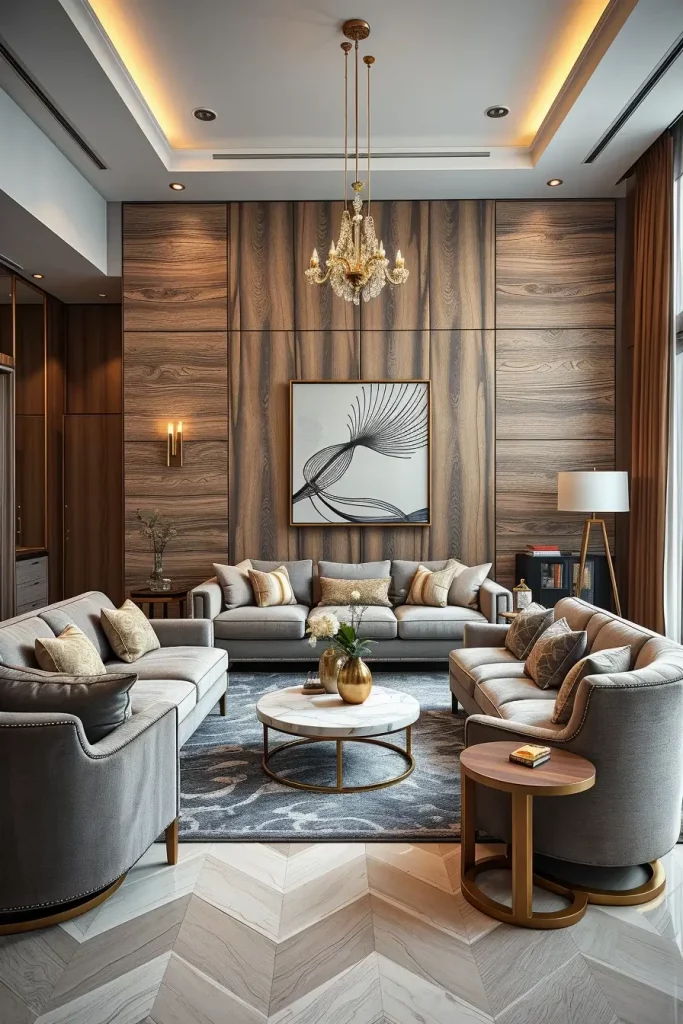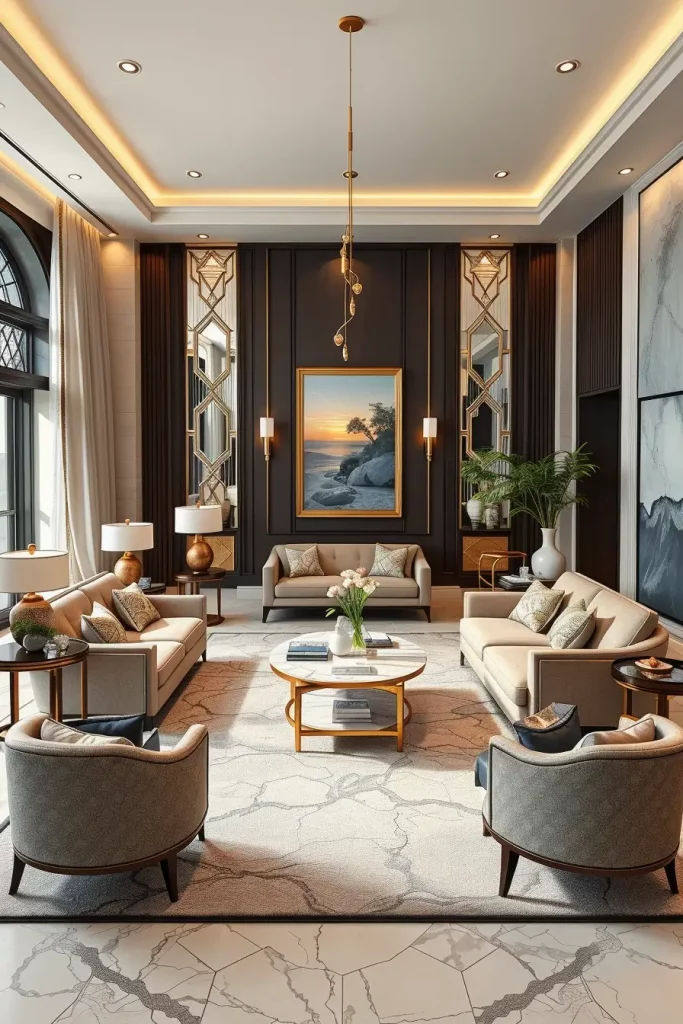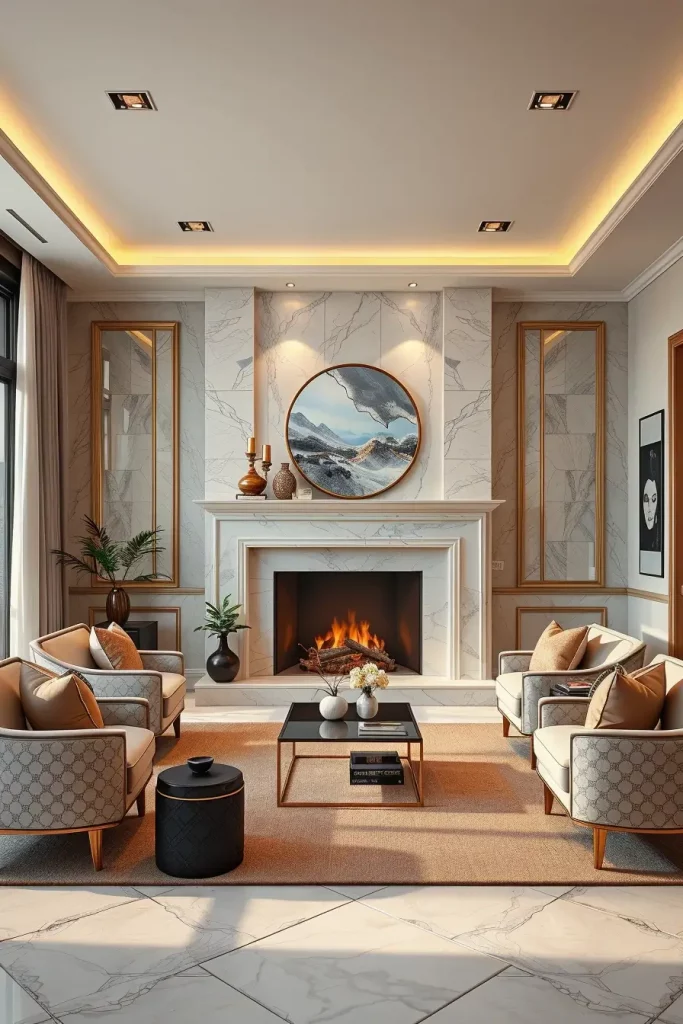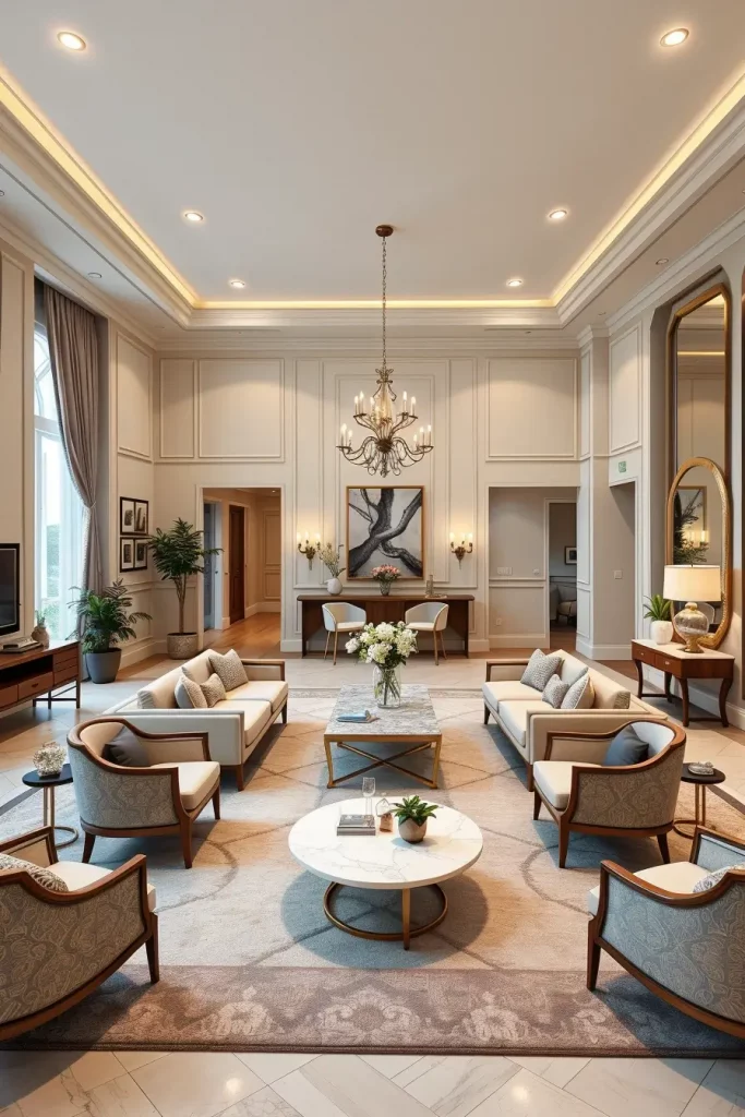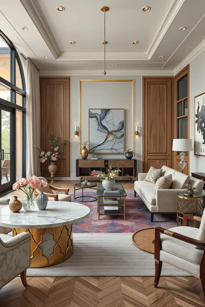 I usually work with such works as boucle armchairs, velvet sofas, marble tables, silk rugs, and brushed metal ornaments. These substances give volume and a feel which brings out the overall feel of the room. Even such minor touches as ribbed wood panels or the sculpted ornaments on the walls can make the room significantly more luxurious.