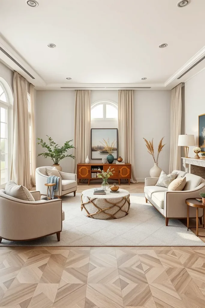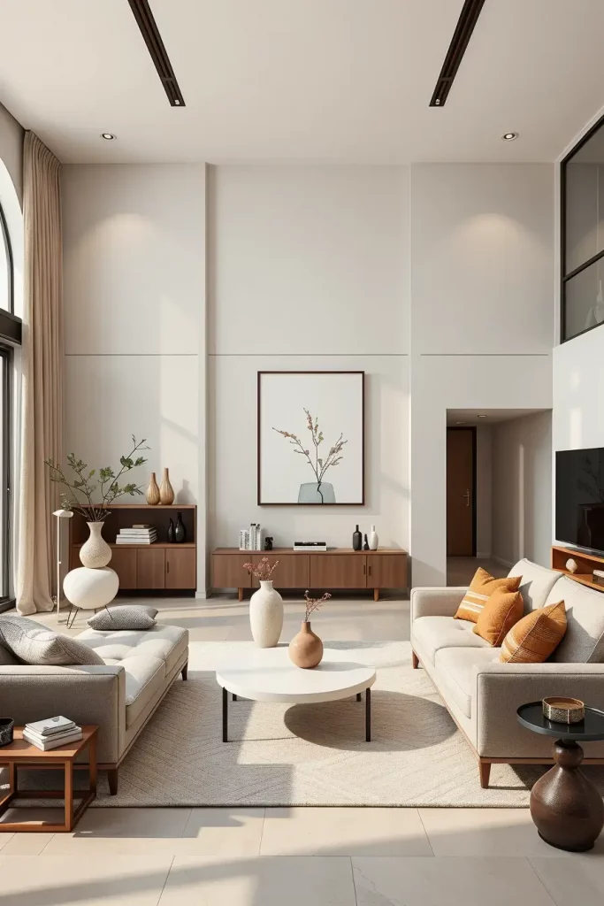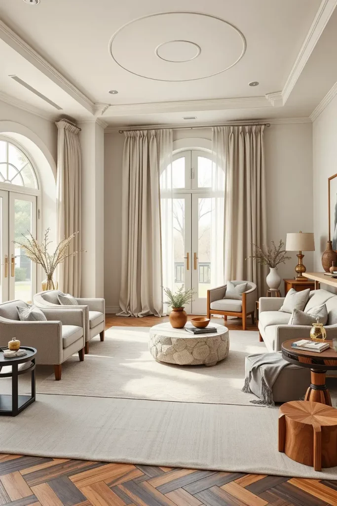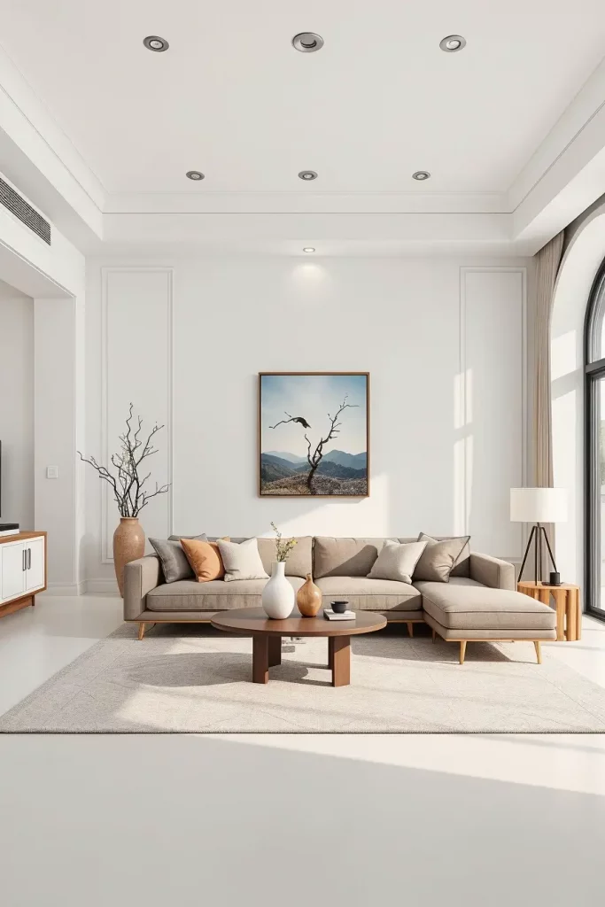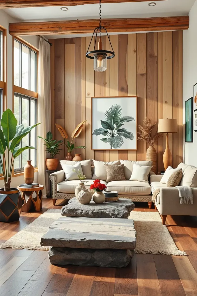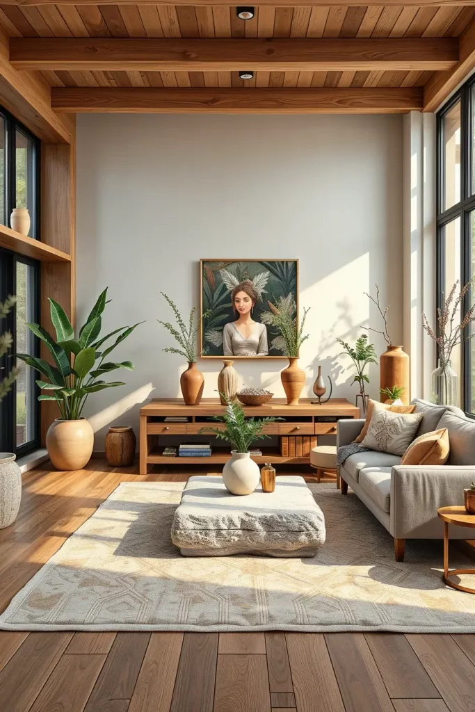 My furniture choices whenever furnishing this kind of living room include solid wood coffee tables, stone end tables and natural fiber seating such as linen or cotton. These objects locate the space, as well as form visual harmony. Ceramic vases, fiber-woven baskets, as well as textured rugs, are also part of the accessories and contribute to the natural palette. Plants- tall, sculptural, in particular- will be put to practical use as they will contribute to the room space adding height and energy, without too much intrusion.