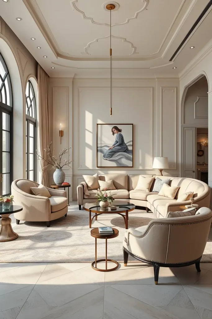 I tend to select such items as rounded sofas, curved lounge chairs, scalloped coffee tables, and circular side tables. These objects are used to disrupt strict lines and provide the piece with fluidity. The luxurious appearance is augmented by matching curved furniture with the high-end materials like velvet, boucle, or natural stone. The trick to it is to make every curve meaningful and to fit the architectural aspects of the room.