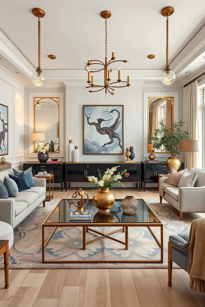 The metallics are most effective when spread in a number of touchpoints and not in a single area. I usually metal is employed in lighting fittings, coffee table frames, shelf brackets ornaments. This brings rhythmic and unifying visuality. Combining warm metals with soft neutrals or deep jewel coloring is an added style to the elegance of the room.