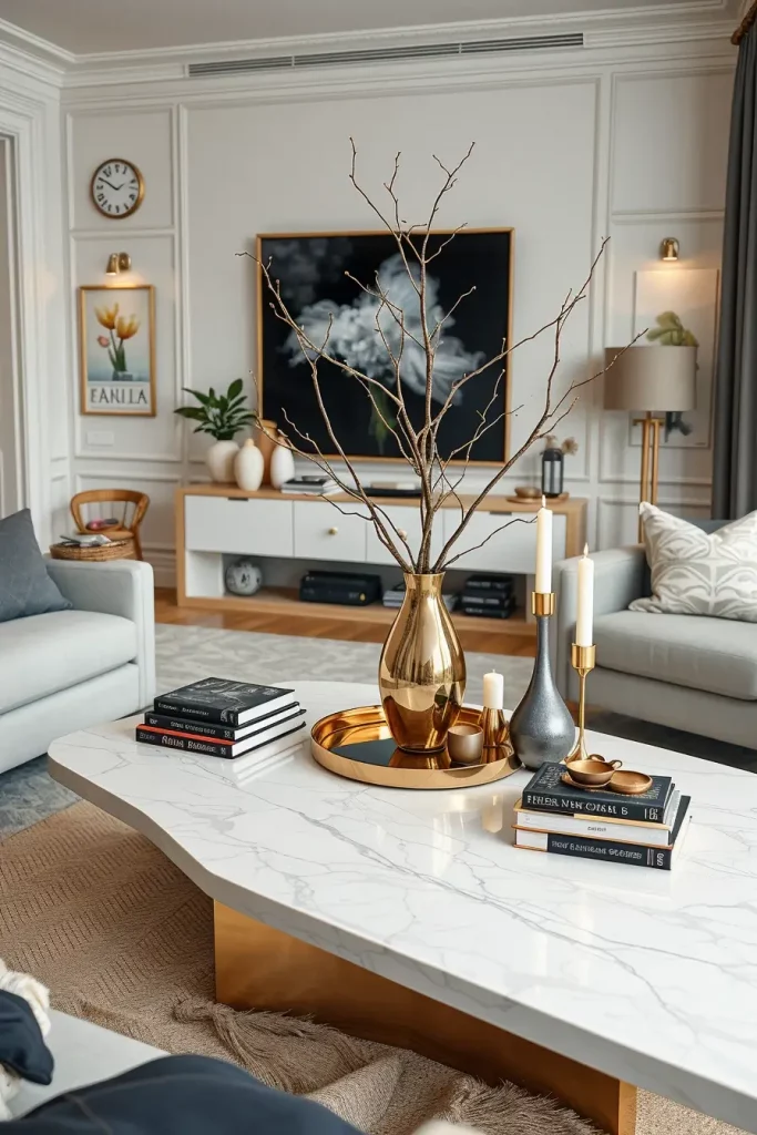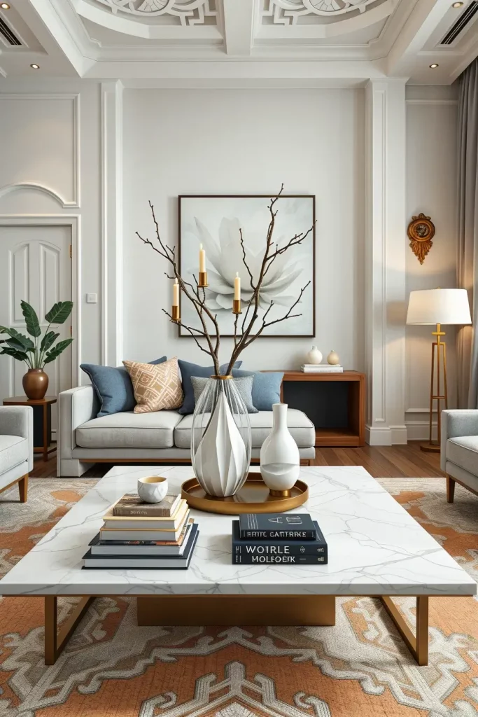 My general arrangement involves the combination of decorative books, sculptural vase, tray and an element of nature like flowers or branches. The table may be round, rectangular or sculptural in accordance to the room although it should be able to blend with the other furniture. Marble and glass, as well as high-quality wood material, are particularly effective to install a fancy accent.