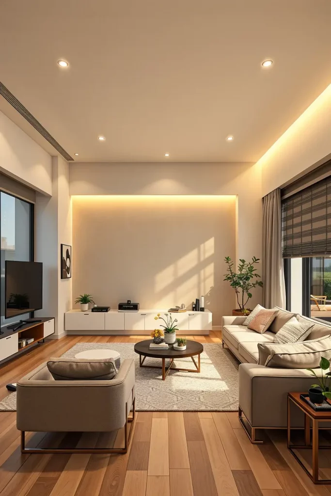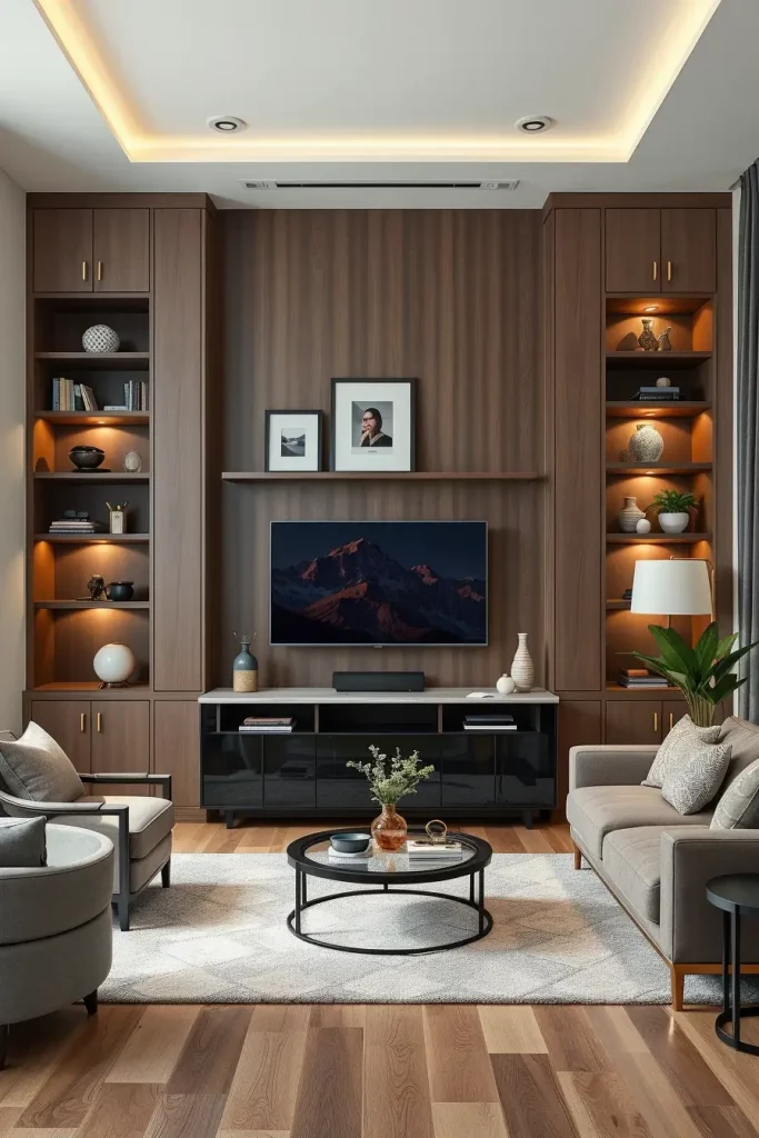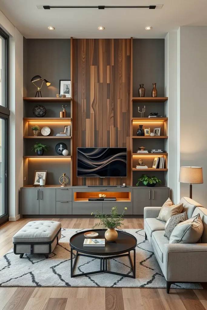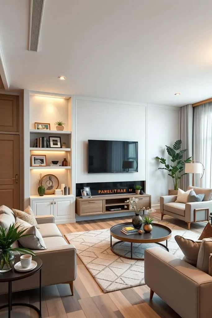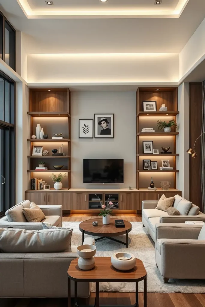 As far as furnishings are concerned, I usually tend to use wall-mounted storage furniture, custom-built built-ins, and coffee tables with concealed storage in them. These enable the homeowners to use every space to the maximum and put away the daily used items. Clean-lined slim media cabinets are appropriate to the style of the contemporary living room, and floating shelves give the space to display curated decor elements. It is aimed at combining the usability with the need to design the room in a way that makes it purposeful and clear.