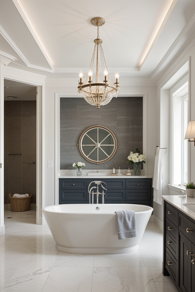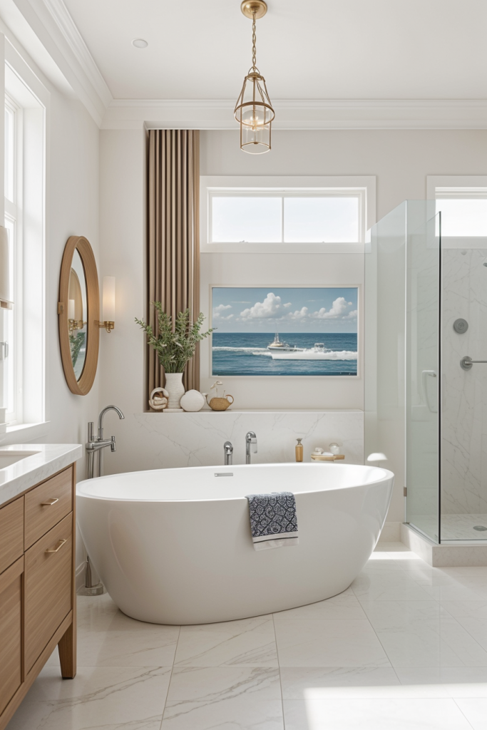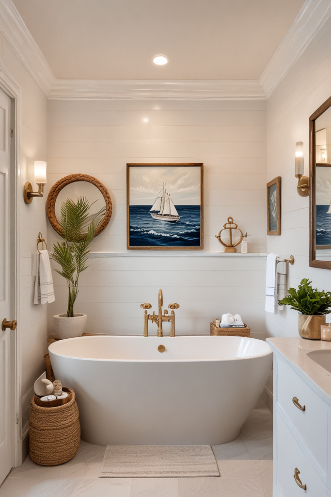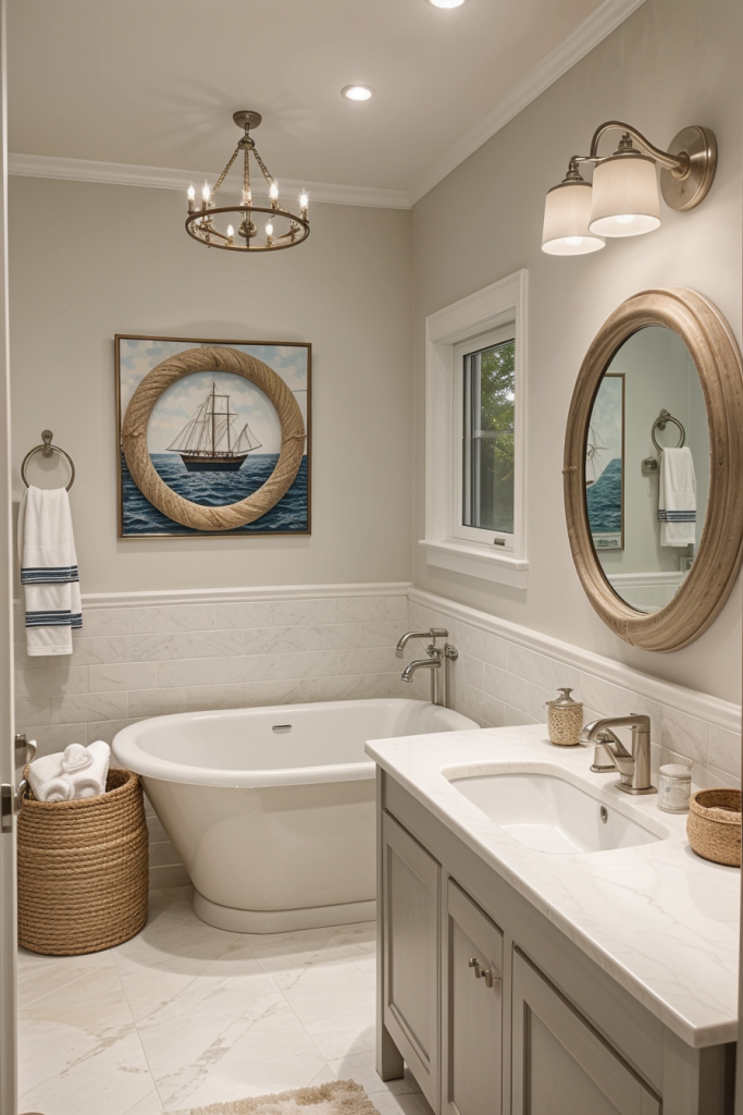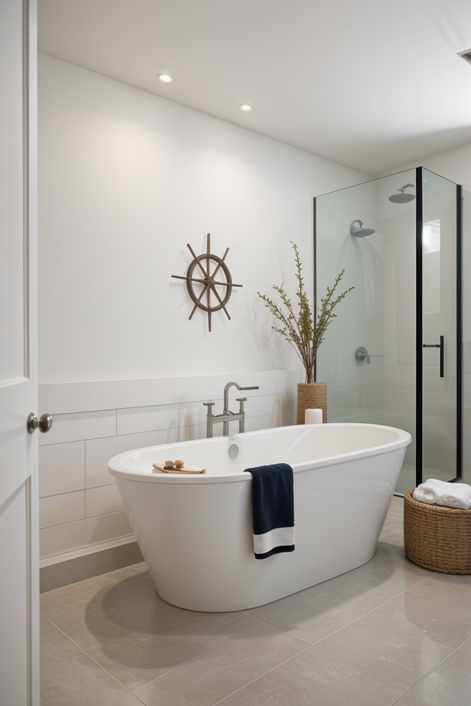 In a coastal bathroom, the integration of modern luxury and timeless nautical charm creates a space of pure beauty and peace. Innovative materials like designer nautical decor, sleek fixtures, and refined finishes intertwined with maritime accents like subtle references to nautical style bathtubs create complication. This architectural psychology changes daily activities into gratifying occasions, blending calming ocean features with advanced contemporary design.