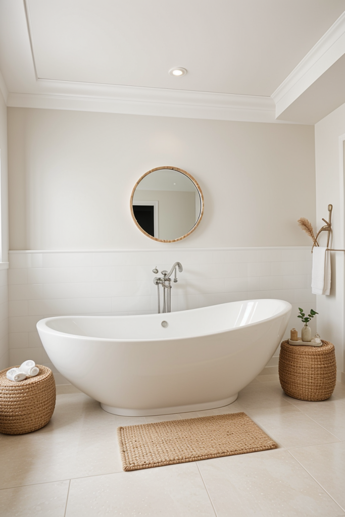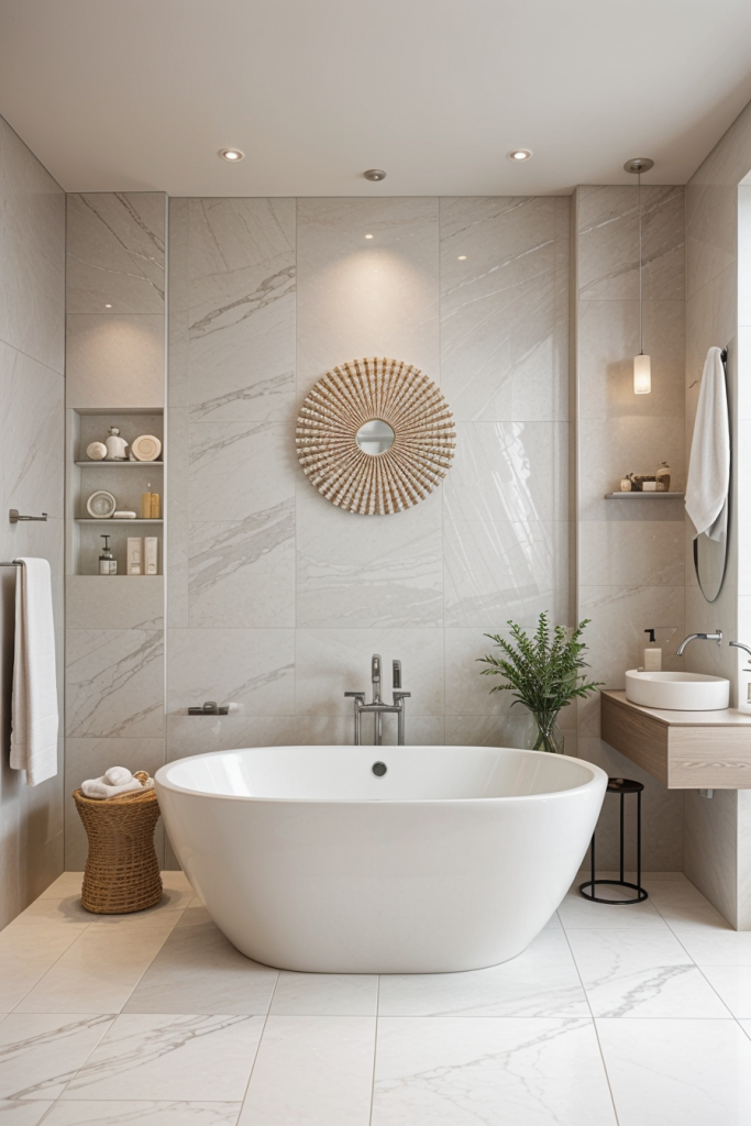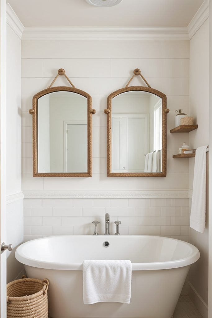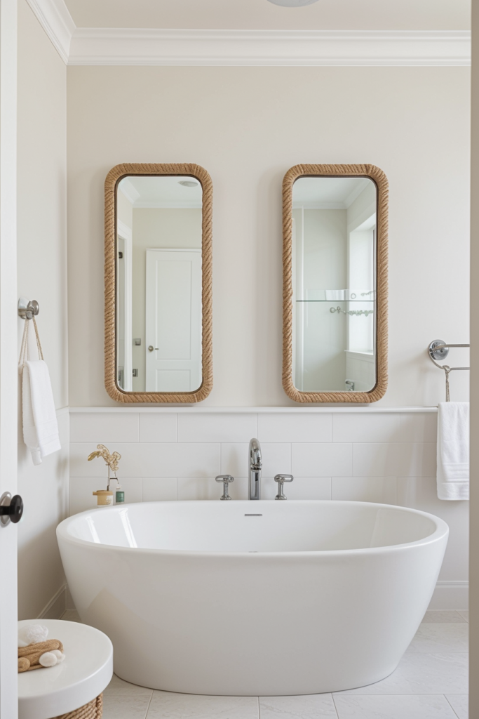 Discreet rope ornaments provide texture and elegance to a nautical-themed room. These accents which are meticulously woven into mirrors and shelving offer subtle references maritime culture in a coastal bathroom. Their ease and organic beauty work effortlessly alongside modern fittings while providing sophisticated style that is practical and ornamental. The final result gives the impression of modern coastal charm—balanced and sophisticated.