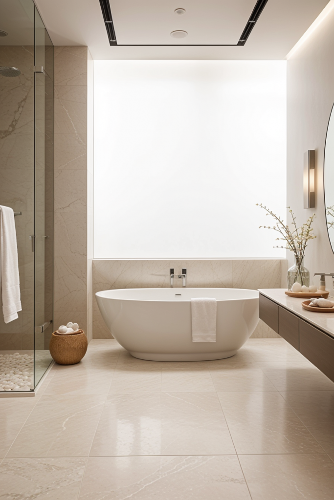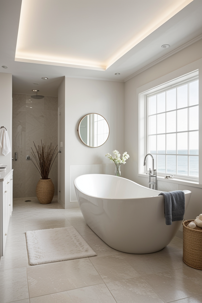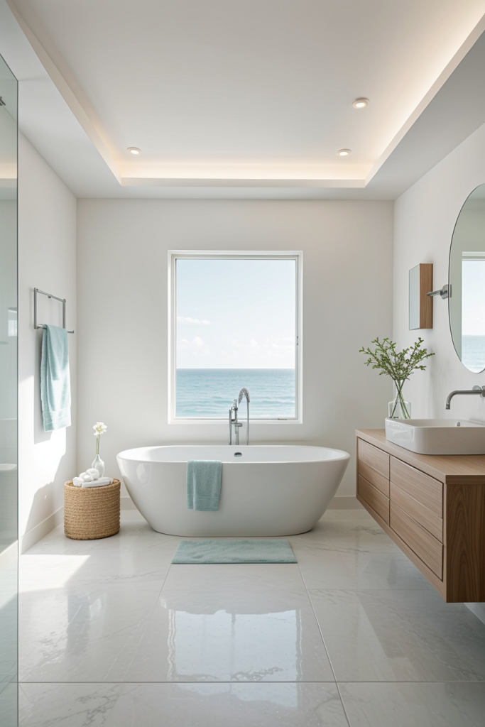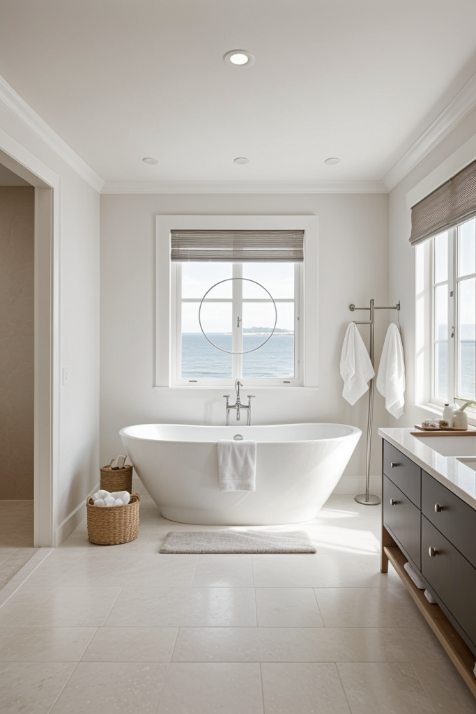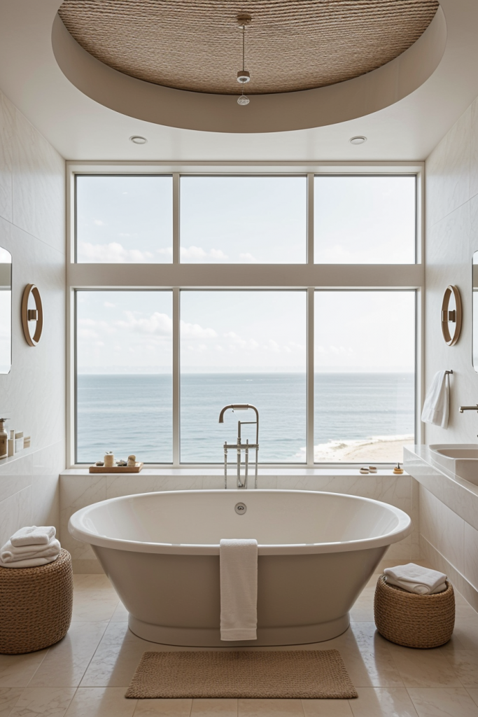 Maritime touches combined with minimalism gives a coastal bathroom both an uncluttered and a rich feel. Ample space and architectural modernity are clean and sharp features, while strategic ocean-inspired decor give soul and character. This approach makes sure the room is calm and useful while keeping the energy of nautical elements.