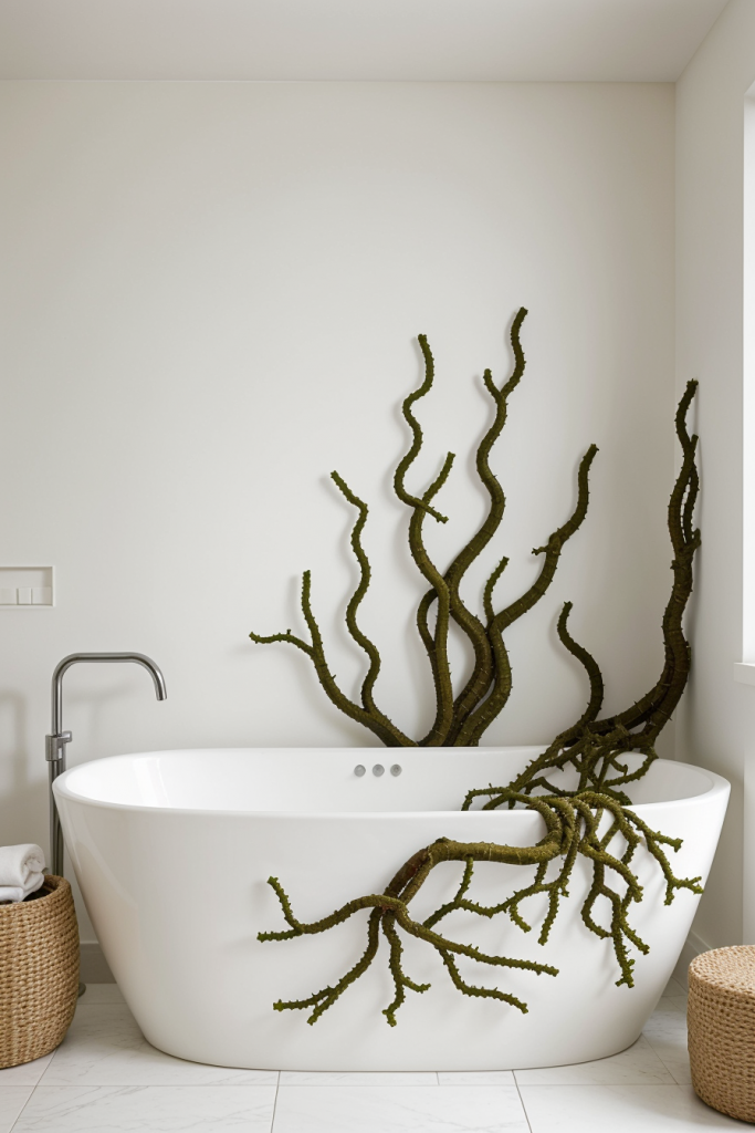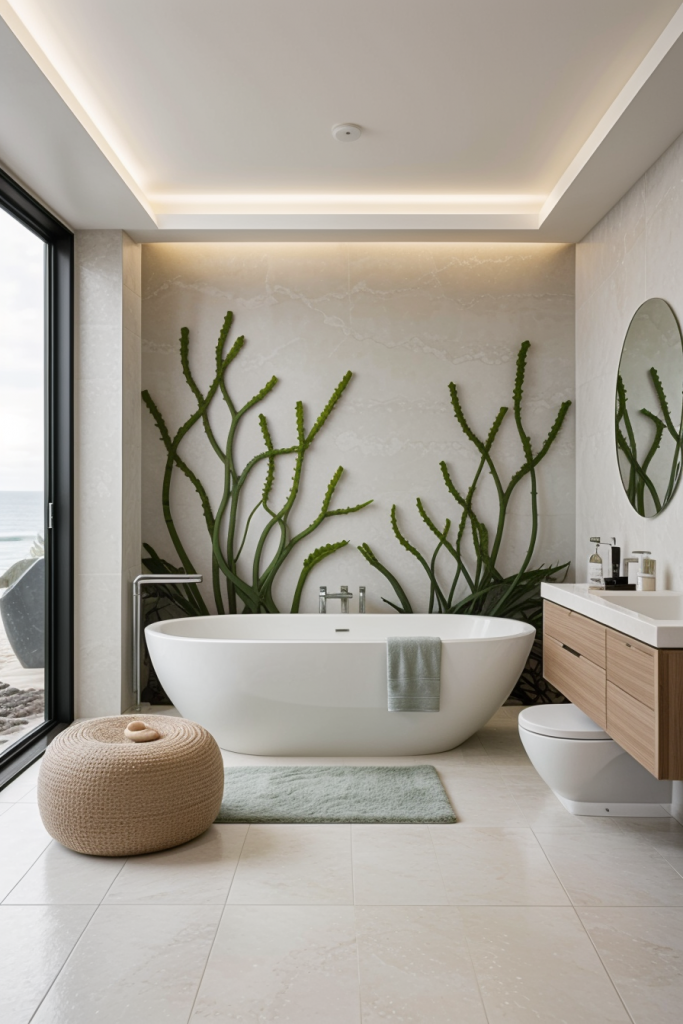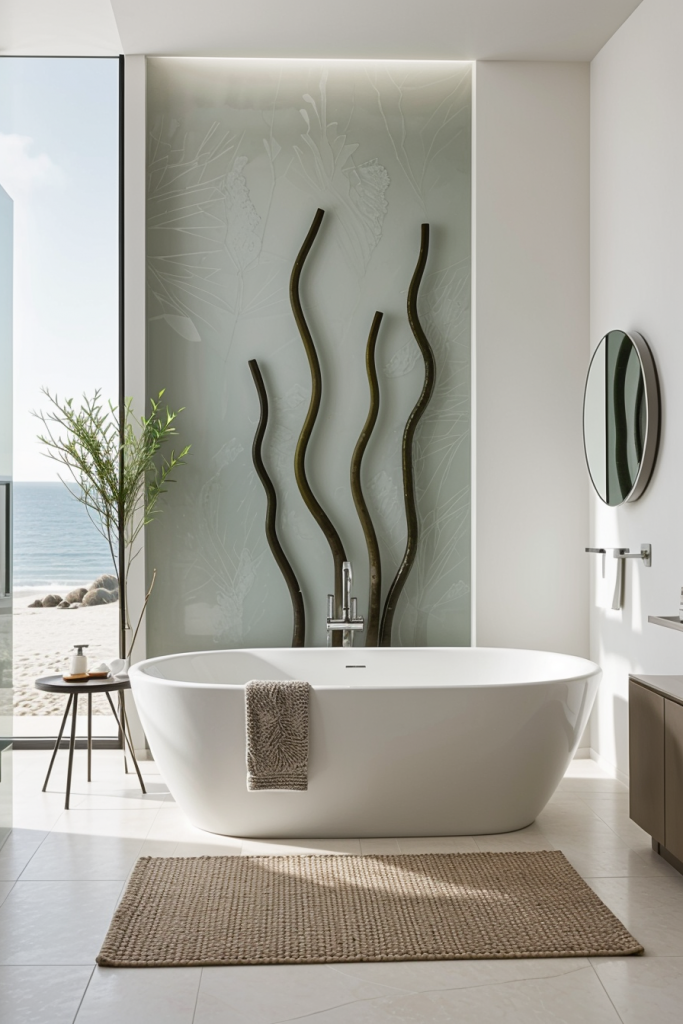 Contemporary designs of seaweed decor reinterpret traditional nautical style into sleek, abstract art pieces. These decorations, which enhance an ocean-themed washroom, merge the realms of nature and modern opulence. This decor captures and shifts focus toward the breathtaking beauty of the sea while directly linking with its organic materials, further enhancing the space.