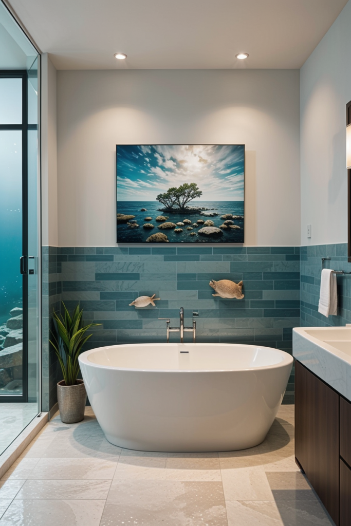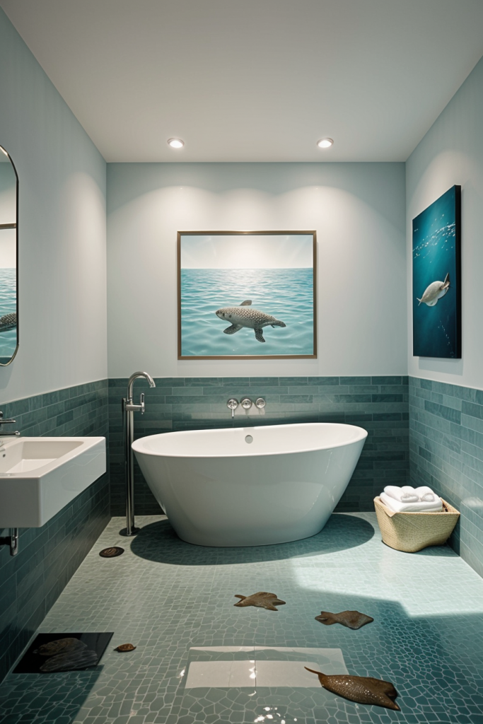 Adding underwater features takes a bathroom from a simple hygiene chamber to an immersive coastal bathroom. Coast bathrooms are enhanced by soft water-inspired touches like sparkling tiles containing fish imagery. These underwater themes foster calmness while also submitting to modern construction style. Rather, it is a design that forms a fusion of form and beauty with utmost simplicity and nature, ensuring the ocean’s serene elegance governs over the structure’s structural elegance.