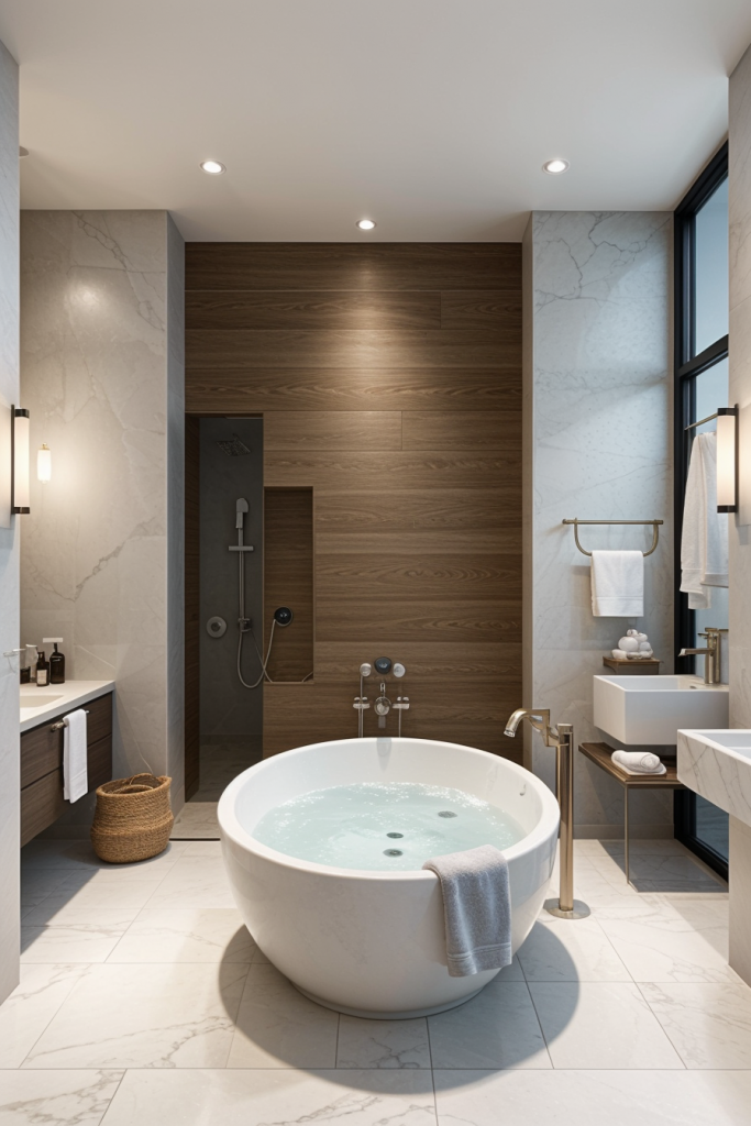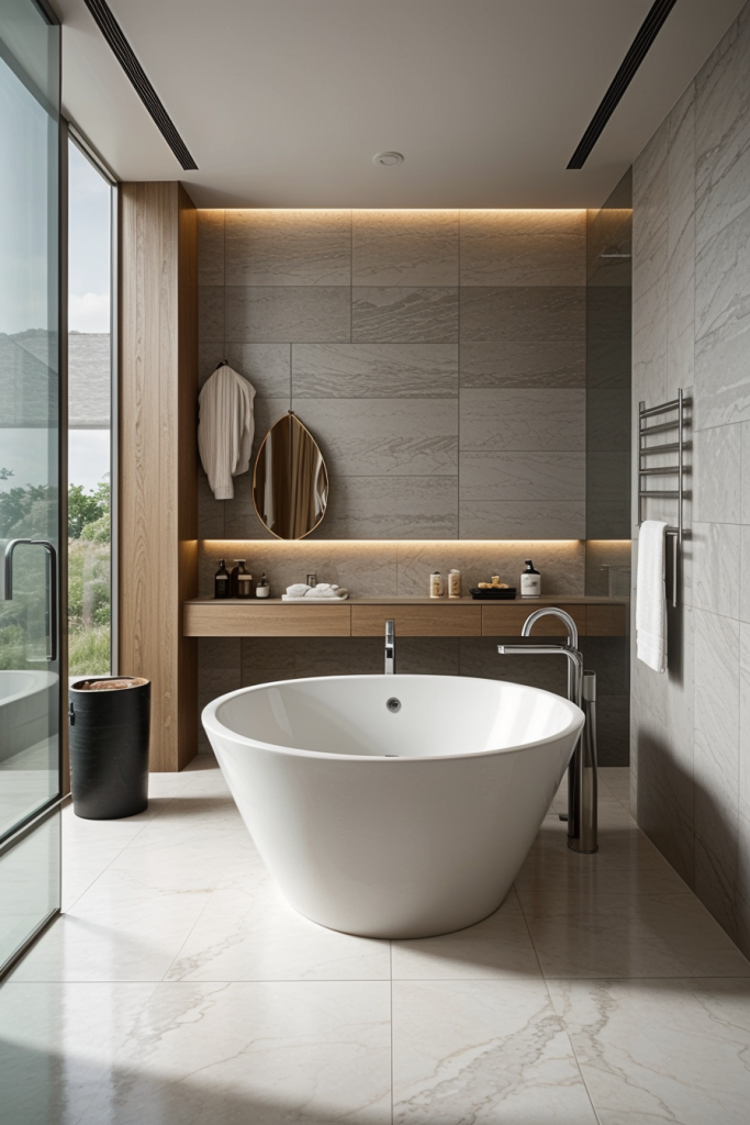 In this space, the centerpiece is a nautical style bathtub, which combines forces with the ocean and incorporates sturdy design. The crowning feature garners absolute attention with its distinctive shape and fine materials that guarantees relaxation and admiration. It’s design further exemplifies the mix between art and function which undoubtedly renders it imperative for the bathroom.