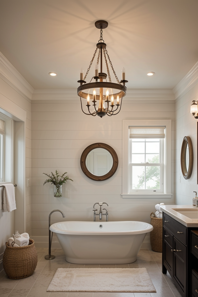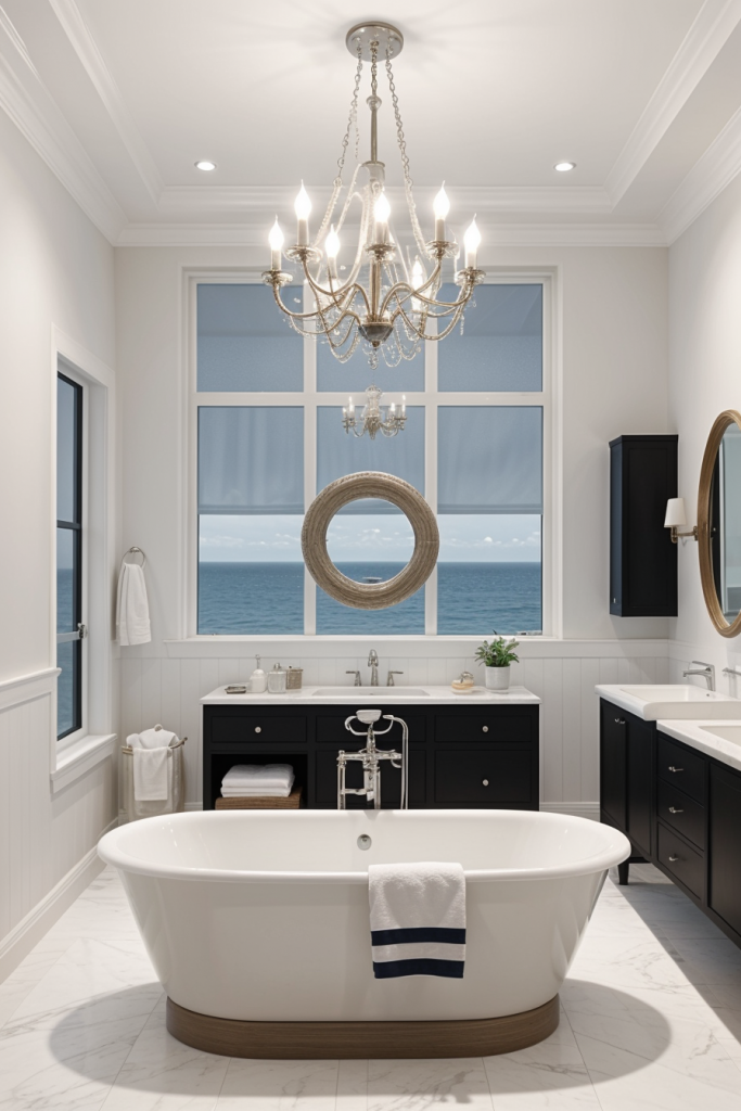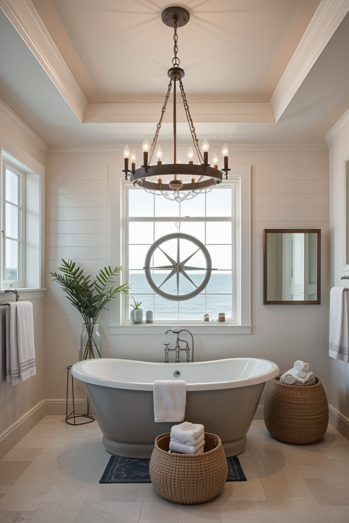 Nautical chandeliers light up a coastal bathroom with spellbinding radiance reminiscent of the ocean’s beauty at sunset. These lighting fixtures blend contemporary style with a nautical theme using ship rigging and aged metals that evoke sophistication. Details in these pieces become a work of art which provide an attractive centrepiece that encourages relaxation and elevated living by the sea.