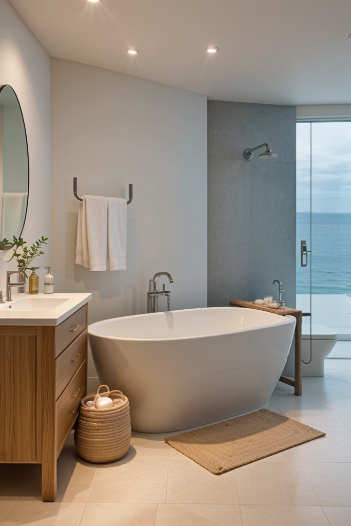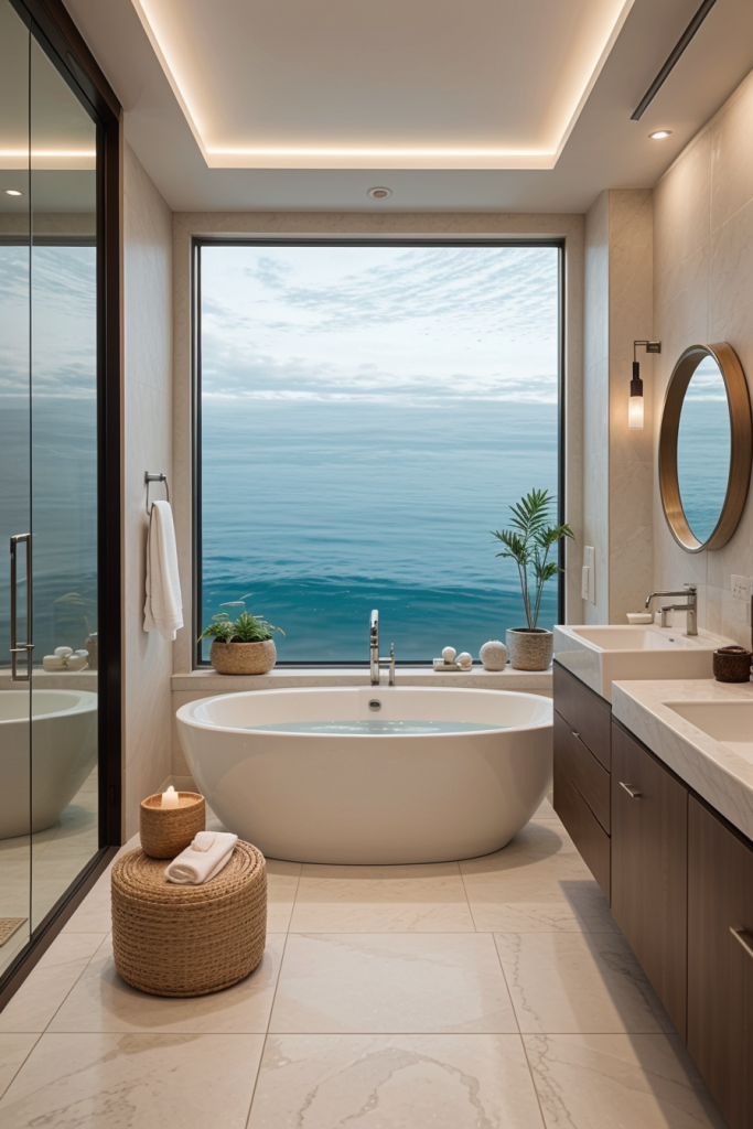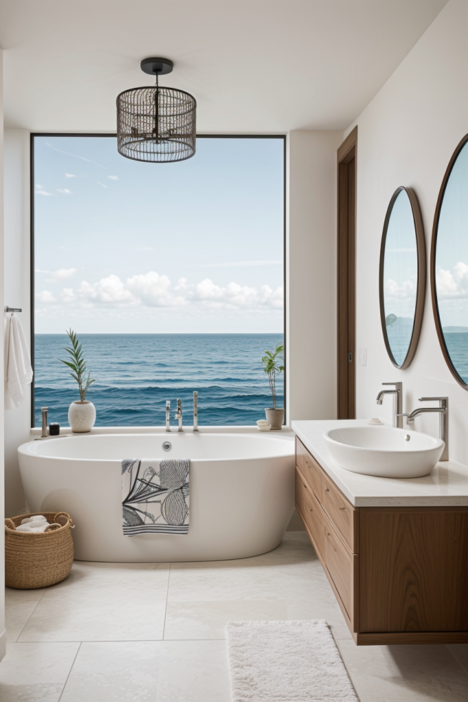 The beauty of an oceanic coastal bathroom inspires a unique charm. The spirit of the ocean is captured in every detail. Nautical style bathtubs compliment modern luxury while designer nautical decor decorates the room in a soothing manner. This article focuses on design elements from statement bathtubs to organic driftwood accents which transform a simple space into an immersive coastal retreat. The attention to detail transports one to timeless coastal beauty.