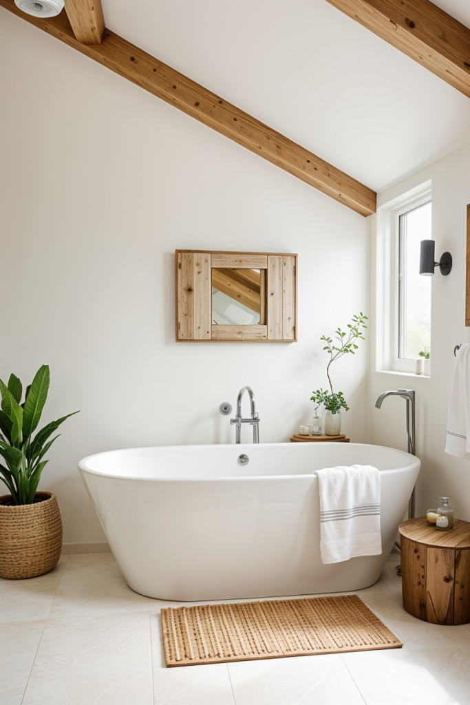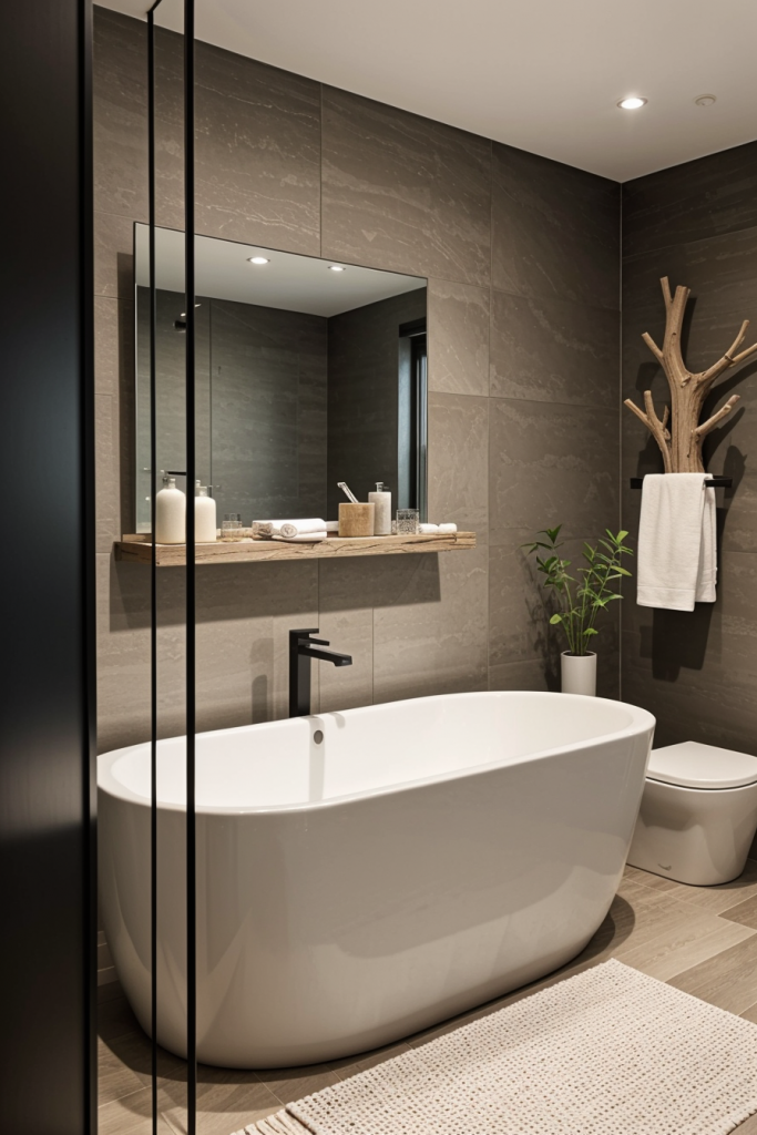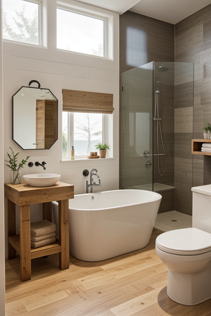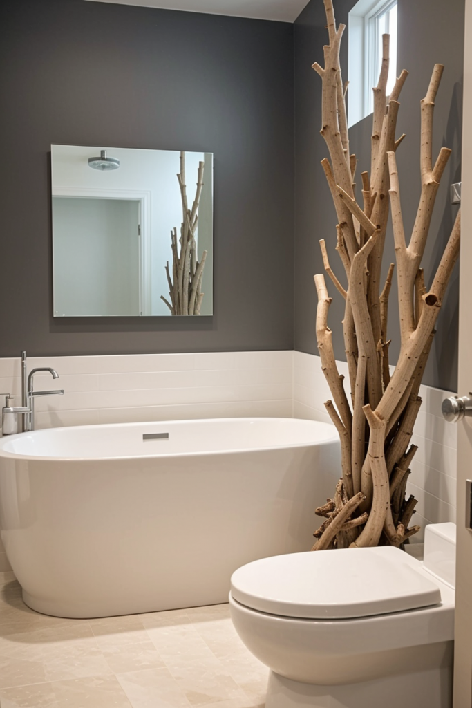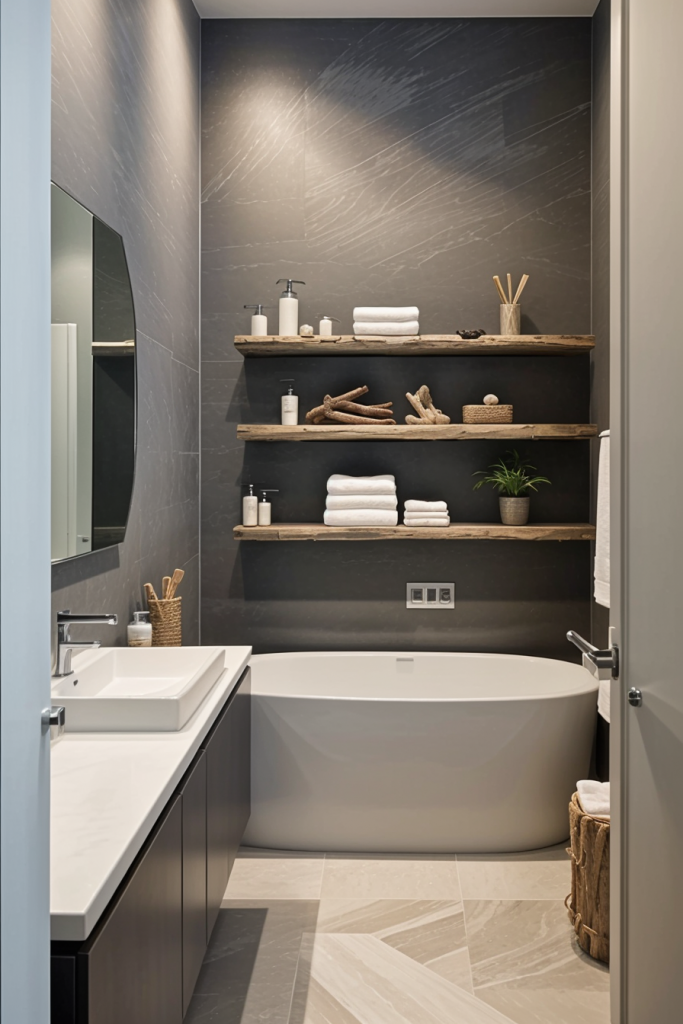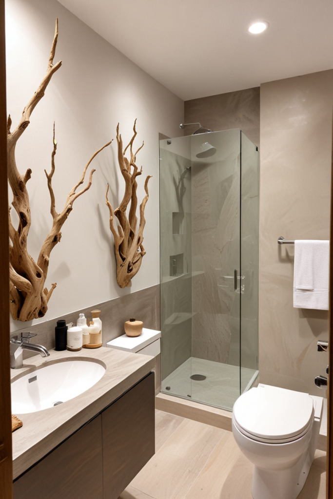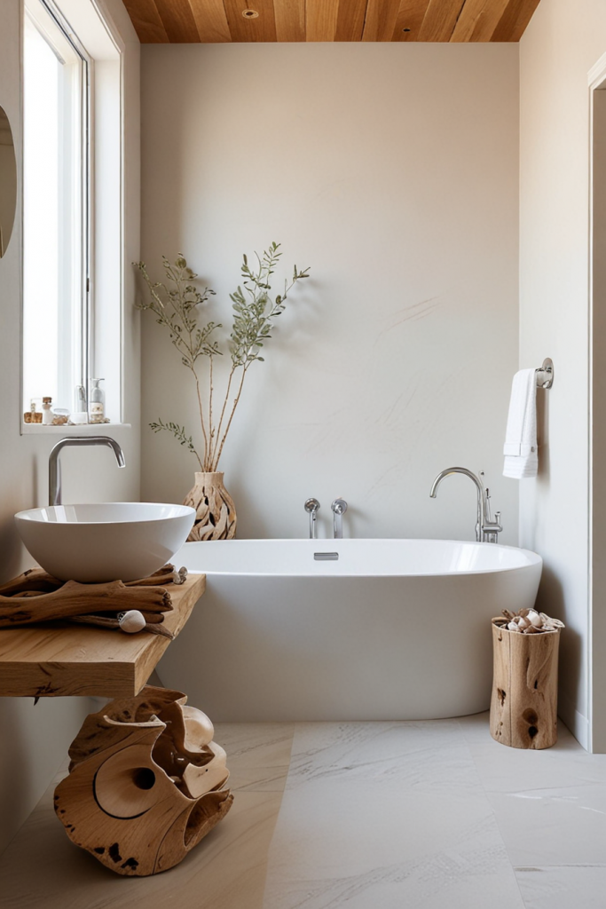 The multifunctional driftwood integration in bathroom design showcases its natural beauty and how it can be used. Driftwood adds nature to a space as shelving, accent pieces, or even custom-made furniture. Driftwood exudes a one-of-a-kind coastal charm while still complementing modern design features.