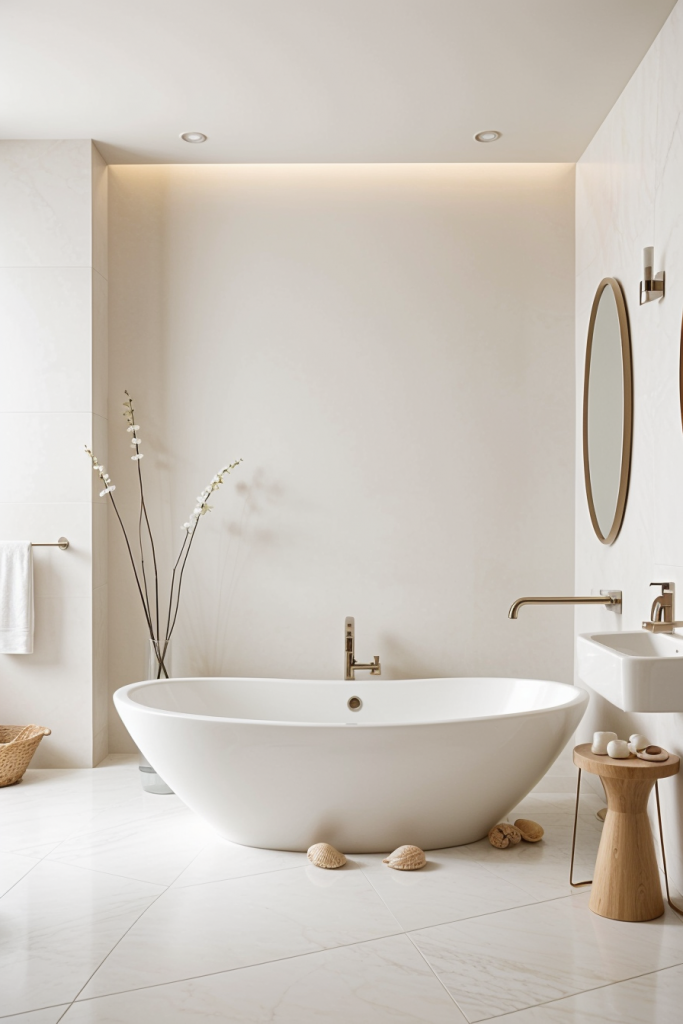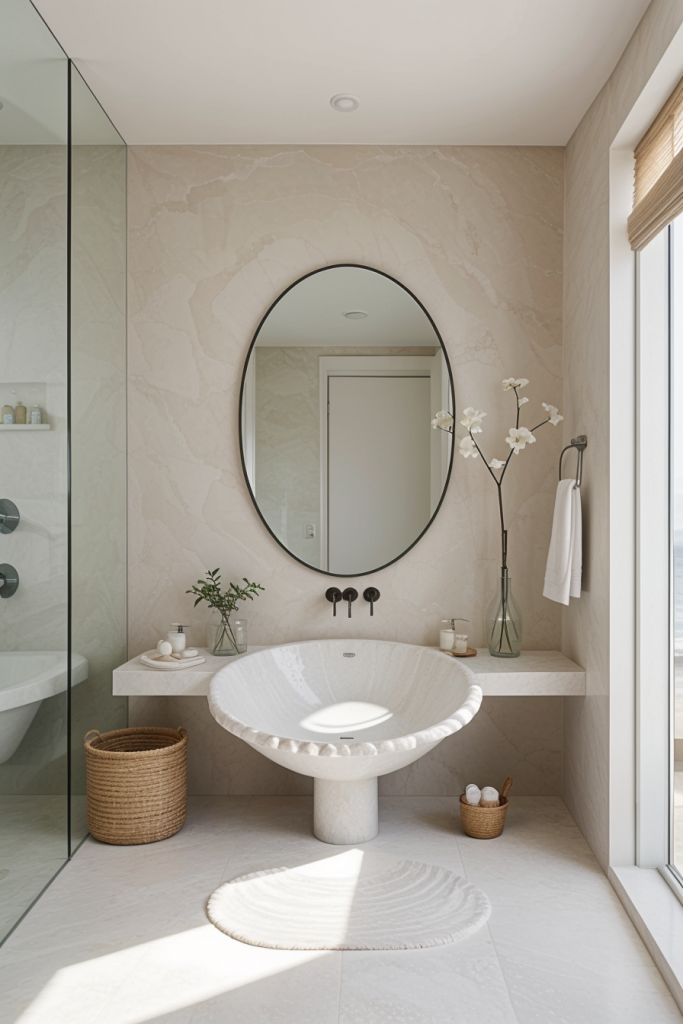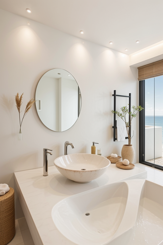 In a coastal bathroom, shell-shaped washbasins compliment both art and function simultaneously. Their soft shapes as well as smooth surfaces provide a striking focal point that is equally appealing and useful. Such objects capture the spirit of the ocean, transforming banal tasks into lush and visually pleasing experiences.