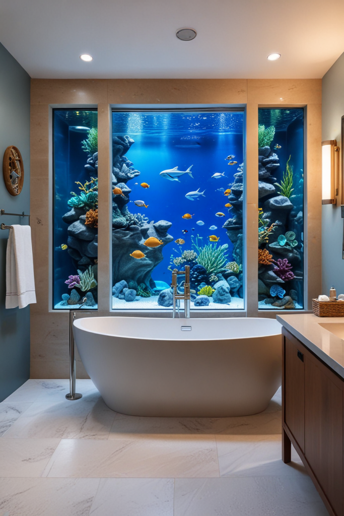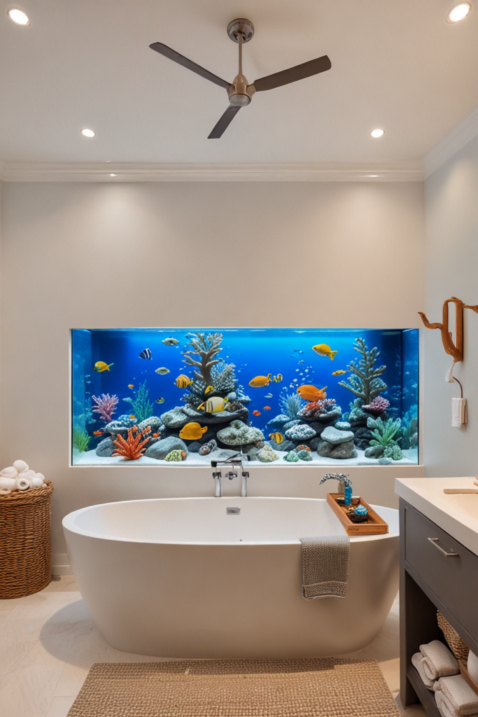 Marine aquariums are particularly exciting because they make a wonderful addition to coastal bathrooms. An aquarium provides sight to behold as it brings to life, light and movement in the space. Such movement complements the pristine design of modern interiors. These water features do not just serve to beautify, but to calm, like the calming expanse of the ocean. Integrating such features showcases the merging of nature with refined art.