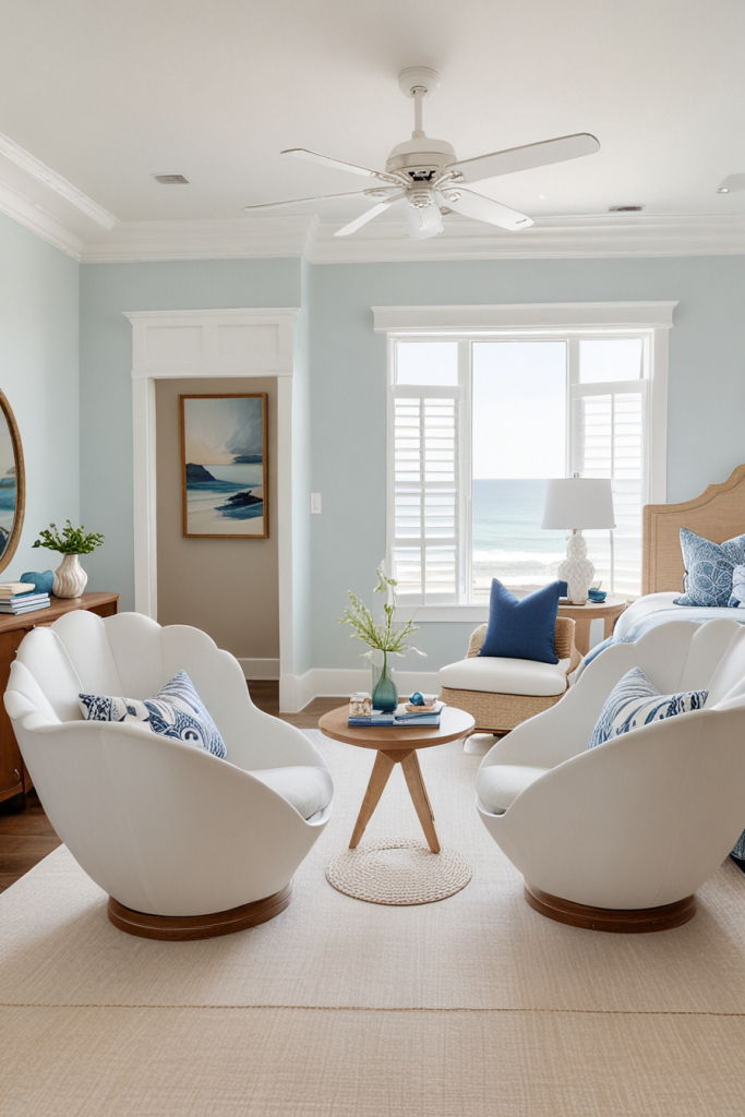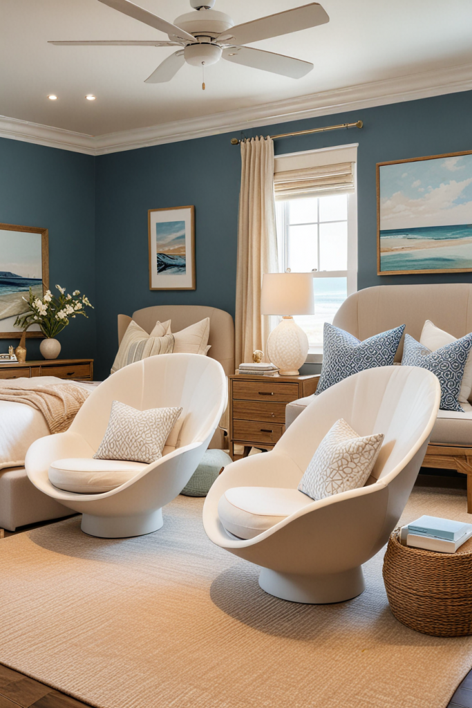 Artistic design perfectly complements the exceptional comfort that the shell-shaped chairs provide for coastal style bedrooms. Each chair embodies a form of functional art that serves dual purposes – a breathtaking sculpture and comfortable seating. The sophisticated charm lies in how fitting these chairs are with the nautical decor of a modern coastal retreat.