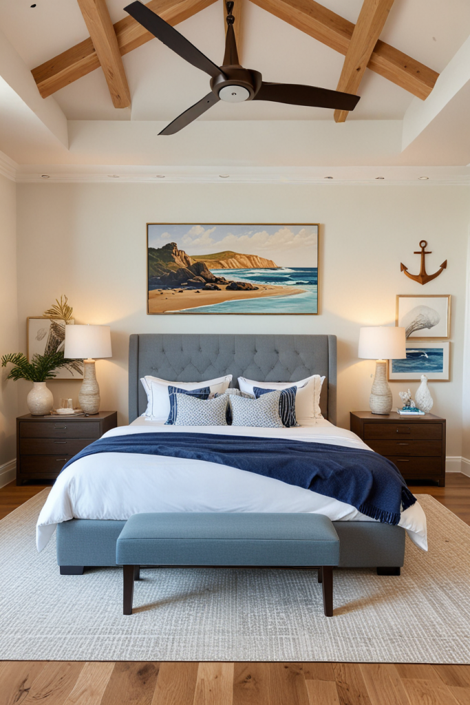 Placing art and sculpture in coastal areas elevates the beauty of a coastal bedroom. Such artistic features stand as focal points that blend maritime culture with modern art. Tacky pieces and bright designs fit well within nautical decor as well as modern design, enhancing the decor and creating an eye-catching culturally vibrant setting.