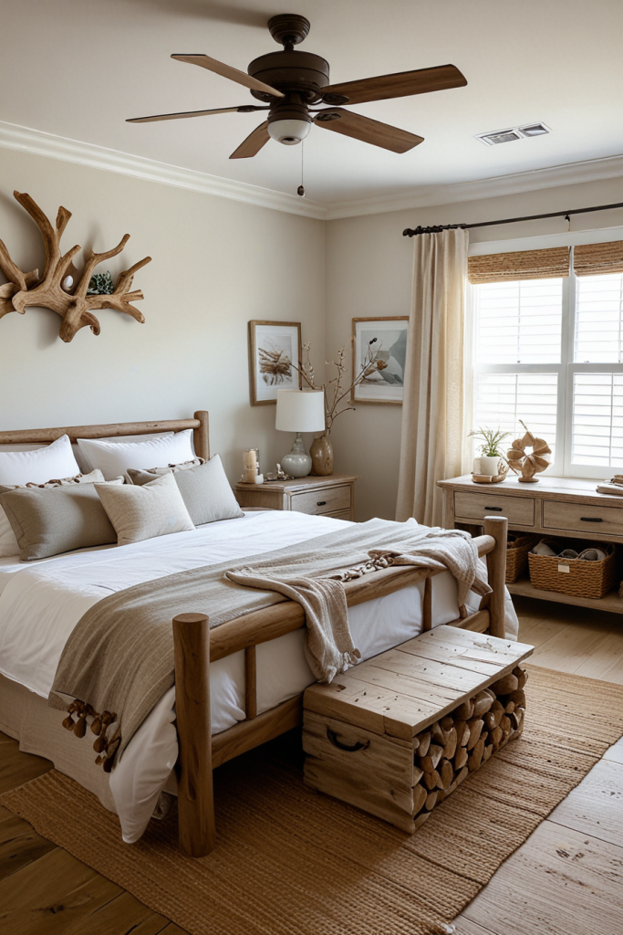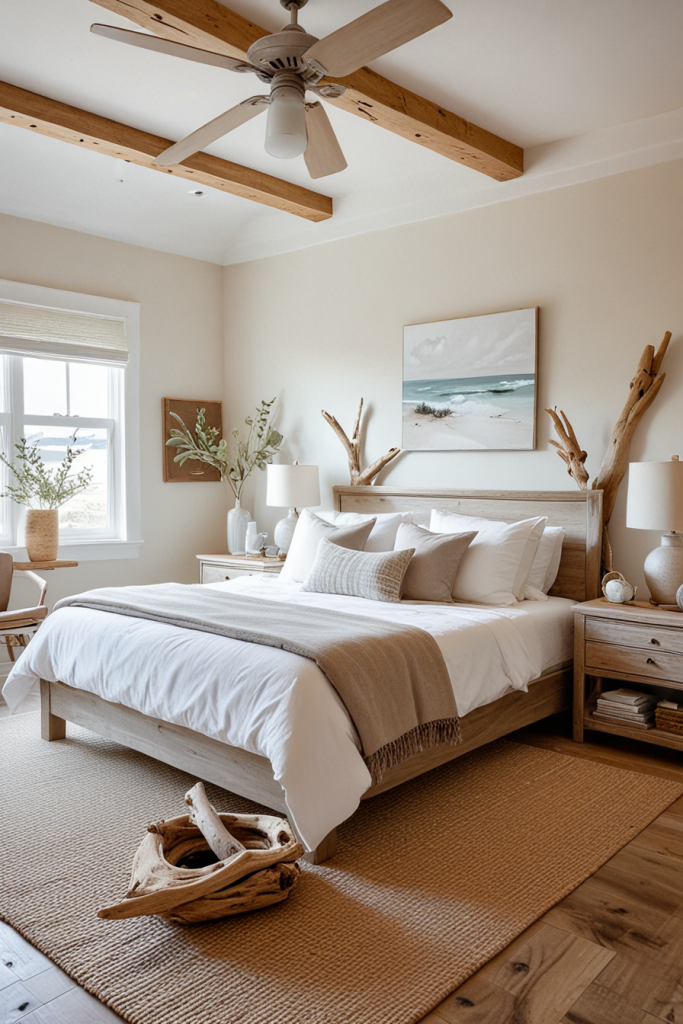 Driftwood centerpieces add rustic elegance to modern interiors; incorporating nature while achieving a sophisticated look. The texture of driftwood gives a natural feel to the space, evoking the sensation of being by the coastline while still keeping with an interior design theme. These centerpieces are perfect for providing warmth and sophistication to a coastal themed bedroom.