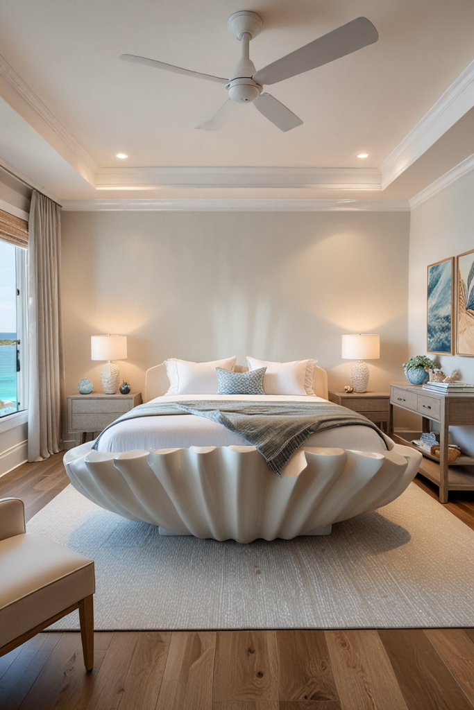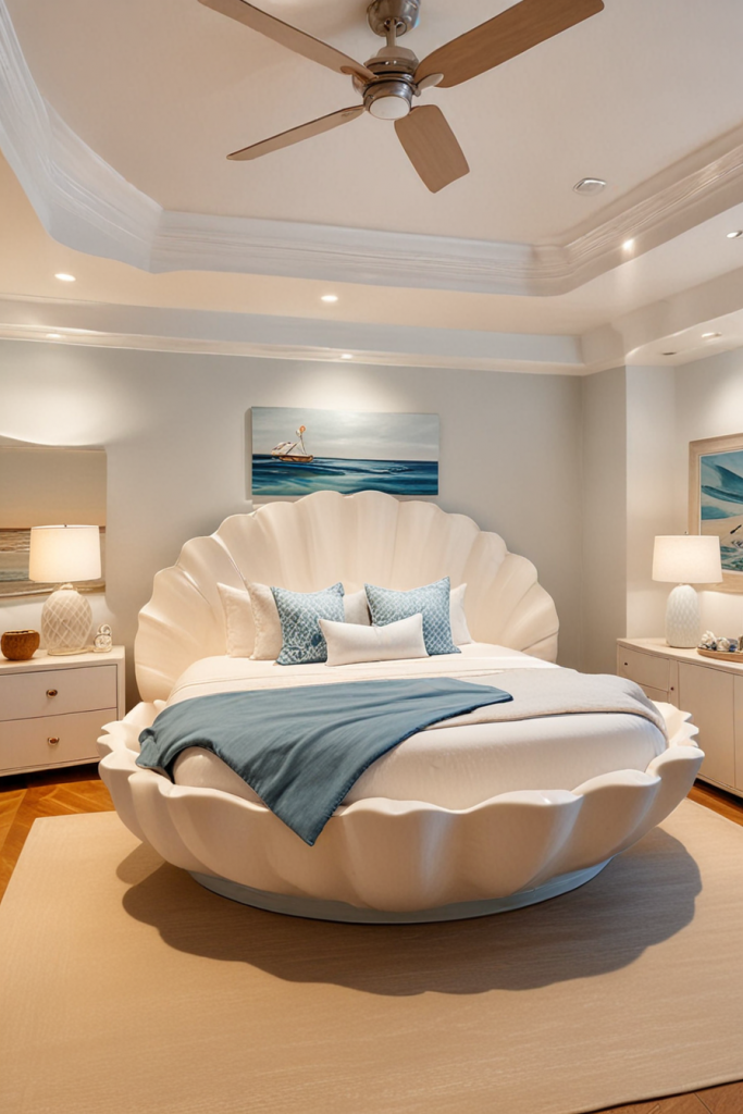 With a unique silhouette and intricate detailing, the shell-shaped bed is a stunning centerpiece that captures the essence of the ocean domain. Its transformative design both allows for functional sleep space and contributes as an art piece that shapes the identity of the room. This bed is of utmost importance for achieving a breathtaking coastal themed bedroom.