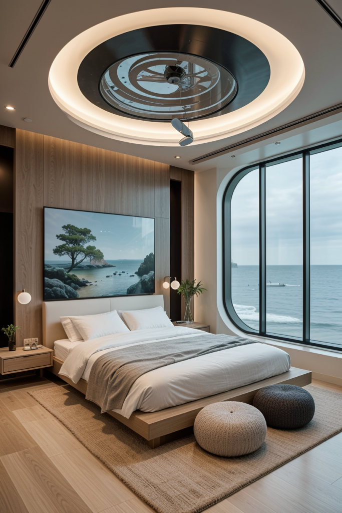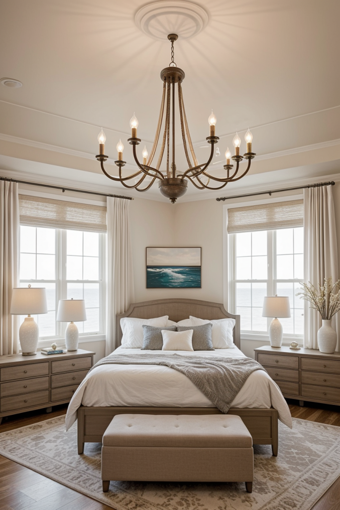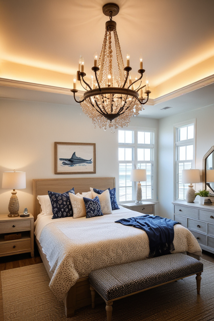 In this coastal bedroom, a marine-themed chandelier with luxurious elegance casts a soft ambient light, merging art and function. This stunning fixture does more than just provide illumination; it increases the sophistication of the nautical decor while reinforcing the contemporary style of the room, fusing decor with advanced design. The chandelier’s elegant design draws inspiration from ocean waves and shells, enhancing the decor’s effortless style.