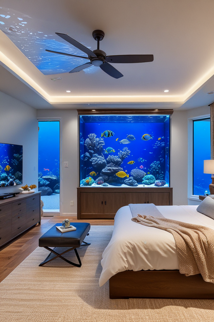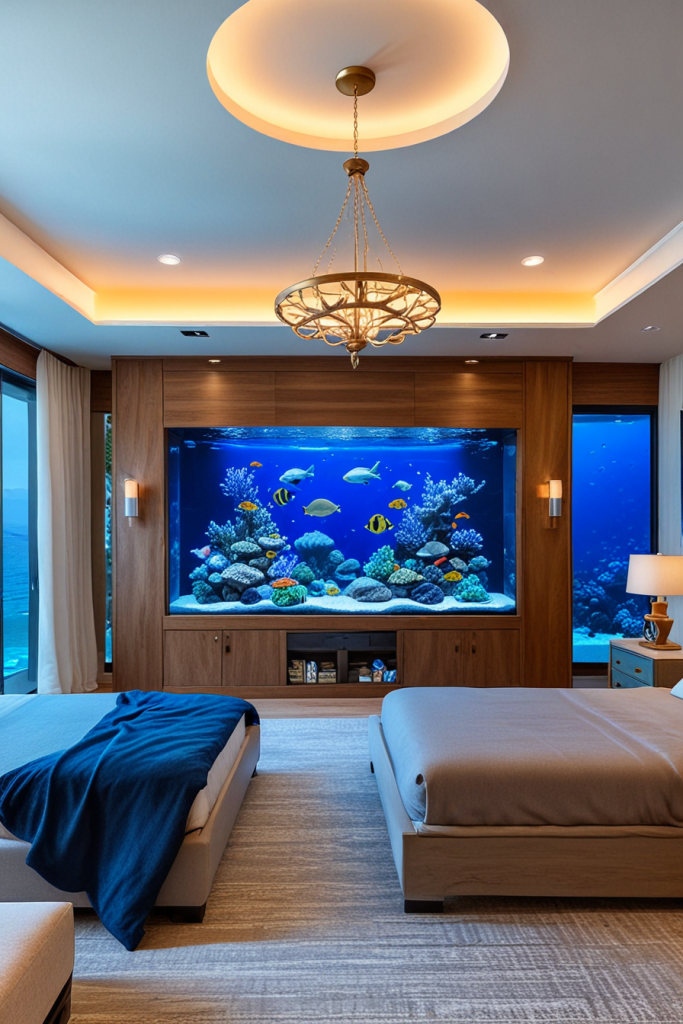 An aquarium with stunning underwater marine decor brings life to the coastal bedroom The marine decor serves a purpose beyond aesthetic appeal, because the viewing of the aquarium adds to the wonderful nautical theme as well. The soothing spaces where eye-catching nature combines with modern design is peaceful and tranquil.