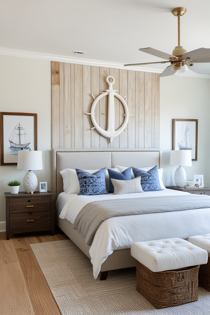 The use of different materials in nautical themed interior design elevate a coastal bedroom from plain to stunning. Mixing smooth surfaces with natural textures like soft linens, weathered wood, and marine-inspired decorations enhances the depth of the room, making it more sophisticated. The careful arrangement of textures not only improves the look, but also makes the room more inviting and physical, enriching the space with a distinctive and inviting feel.