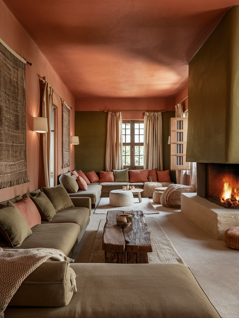 Green color has long been associated with life, thus the green and cromite living room evokes the life-affirming concept itself. The colors like terracotta, olive, and buff grey are the bearer of warmth, earthiness, and tranquility of nature. The earth tones that are the basis of the color scheme are particularly well chosen matched with the raw materials that are used here – wood, stone, and linen – which make the place seem linked to nature.